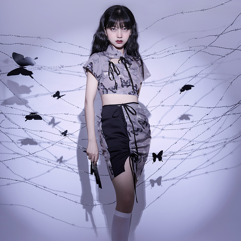 套装设计,省去搭配烦恼,蝴蝶结装饰,少女感十足,灰色的色调,时尚又百搭,旗袍版型,彰显优雅气质。