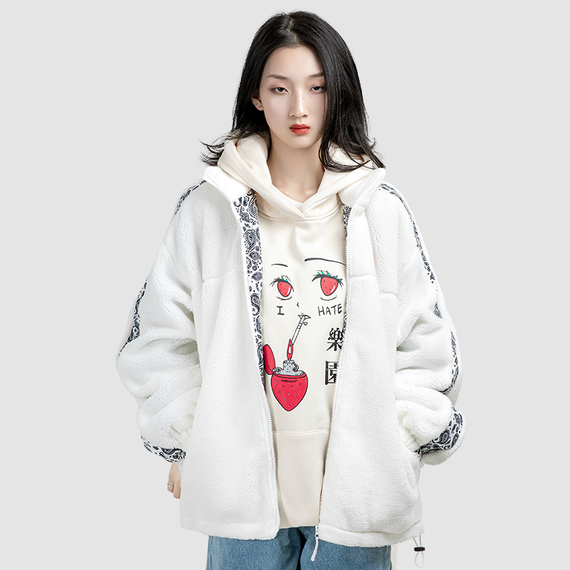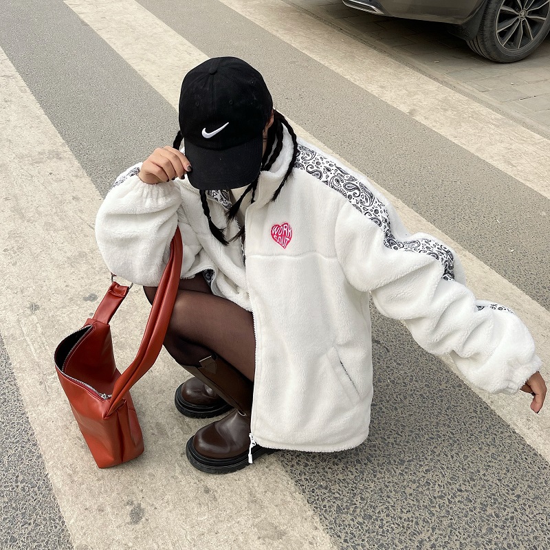这是一款羊羔毛外套。宽松的版型设计,上身舒适自在。
