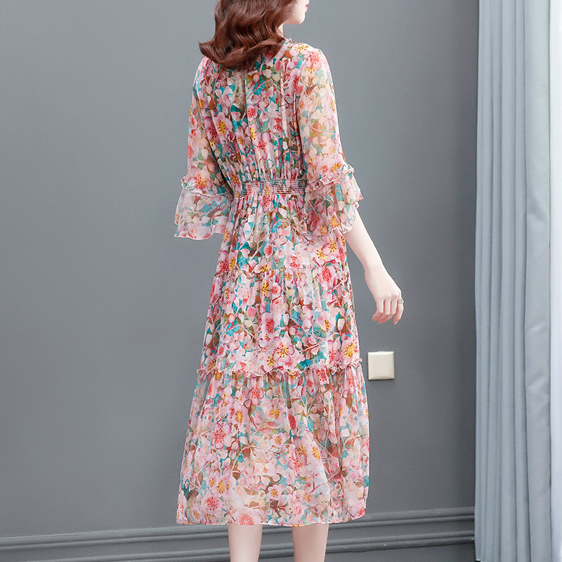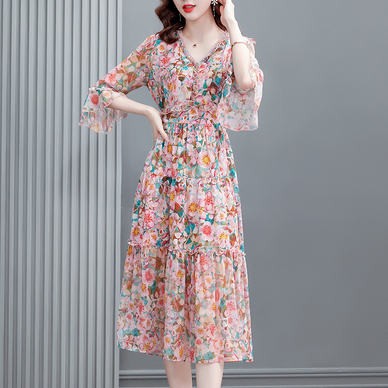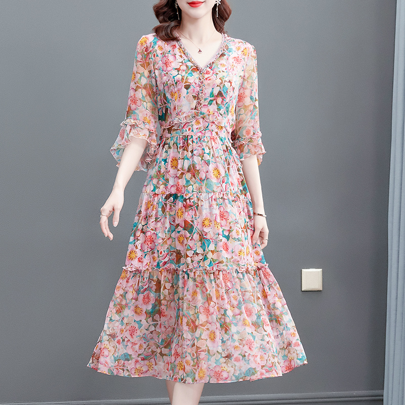 真丝面料的连衣裙,轻薄透气,上身舒适自在,碎花的点缀,增添了几分甜美的气息,宽松的版型,不挑身材,穿着舒适,优雅迷人。
