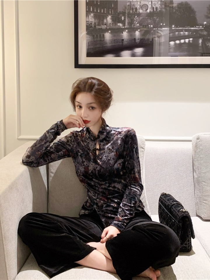 平整圆滑的剪裁,轮廓优美,恰好漏出迷人锁骨,优雅动人,下摆设计富有层次感,精致剪裁,修饰身形,手臂采用金丝绒面料,简约舒适,简约大方的设计,线条流畅自然。妈妈时尚百款减龄必备款