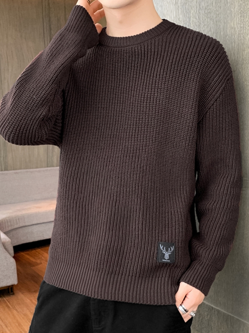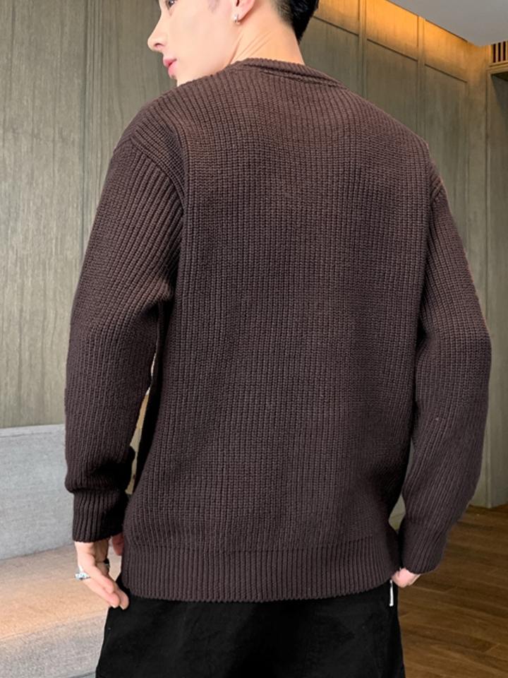 咖啡色的男士毛衣,简约又百搭,下身搭配一条黑色的休闲直筒裤,和一双休闲运动板鞋,尽显满满的青春潮流感,时尚又休闲。