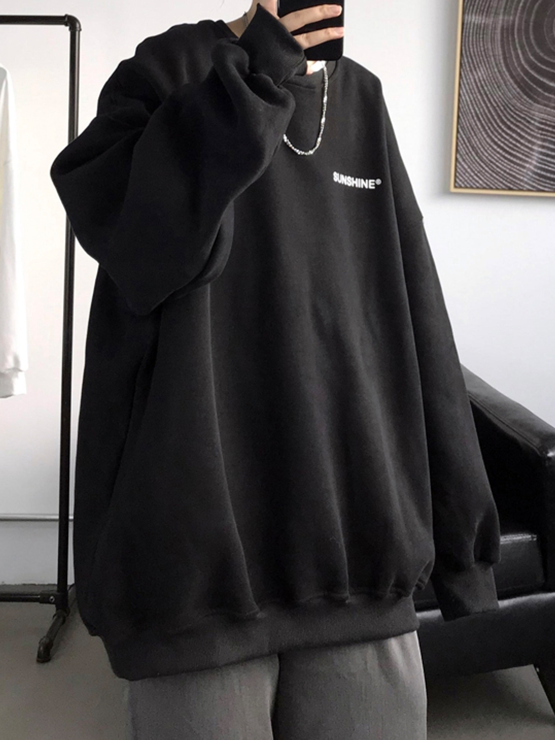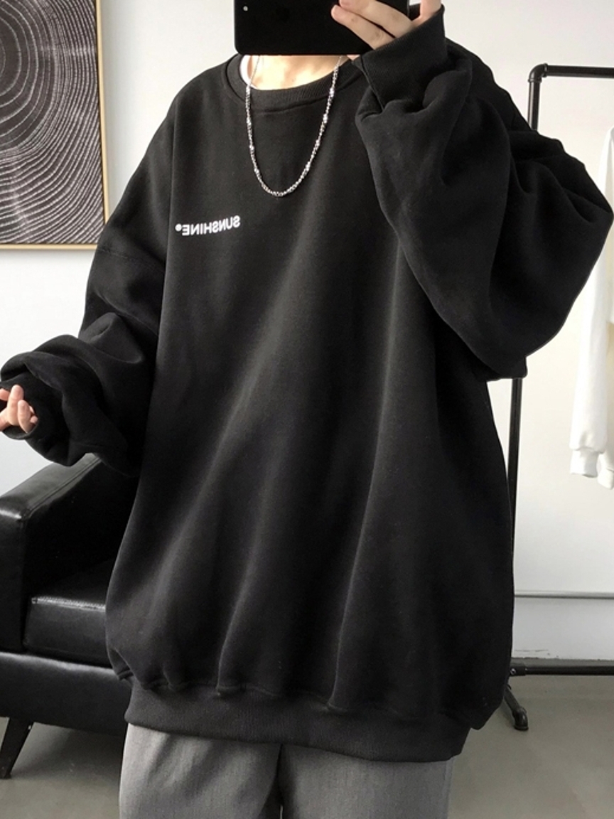 黑色的打底色,配以衣身胸前撞色的英文字母装饰,增添了整体的时尚感,并丰富了整体的视觉层次感,时尚又美观。