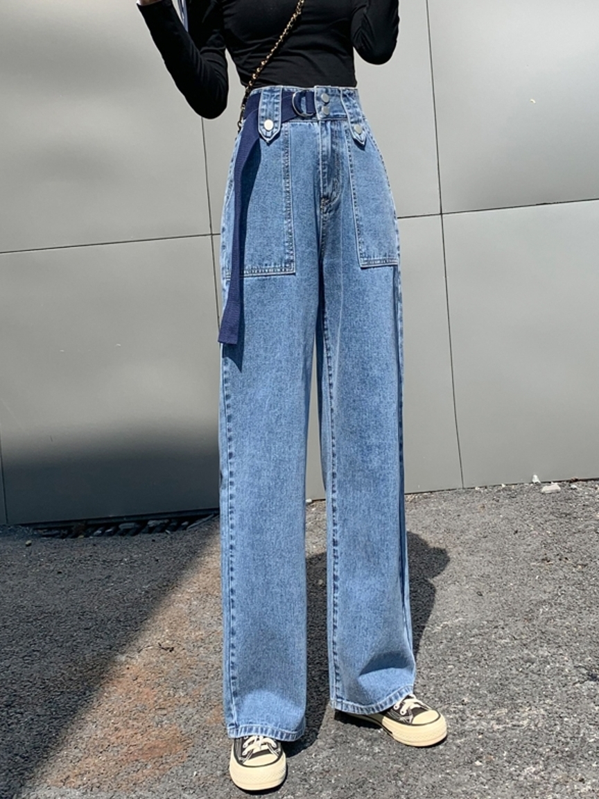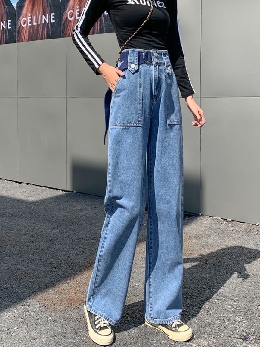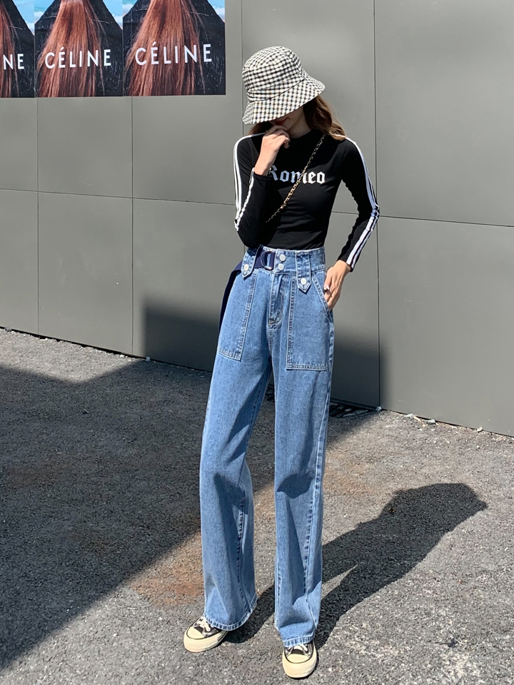 高腰设计,拉长身材比例。高腰牛仔裤,显瘦显腿长。直筒裤型,修饰腿部线条。