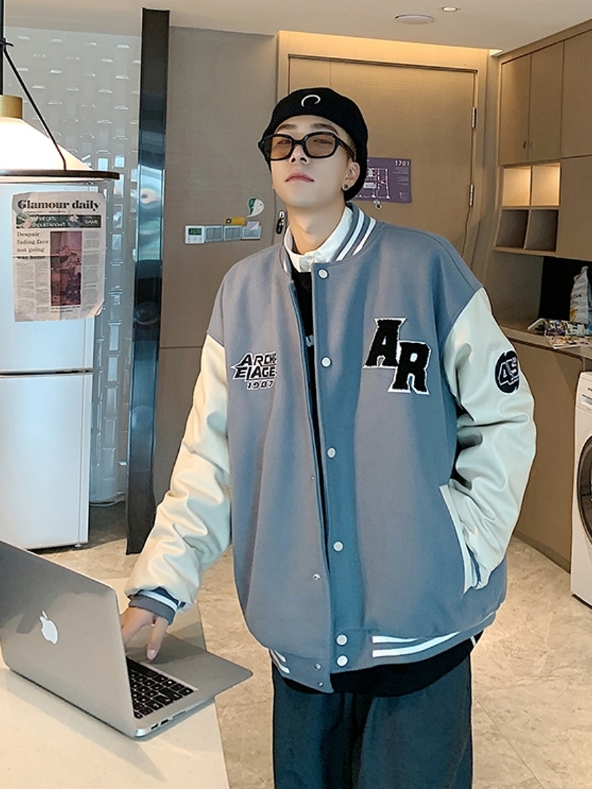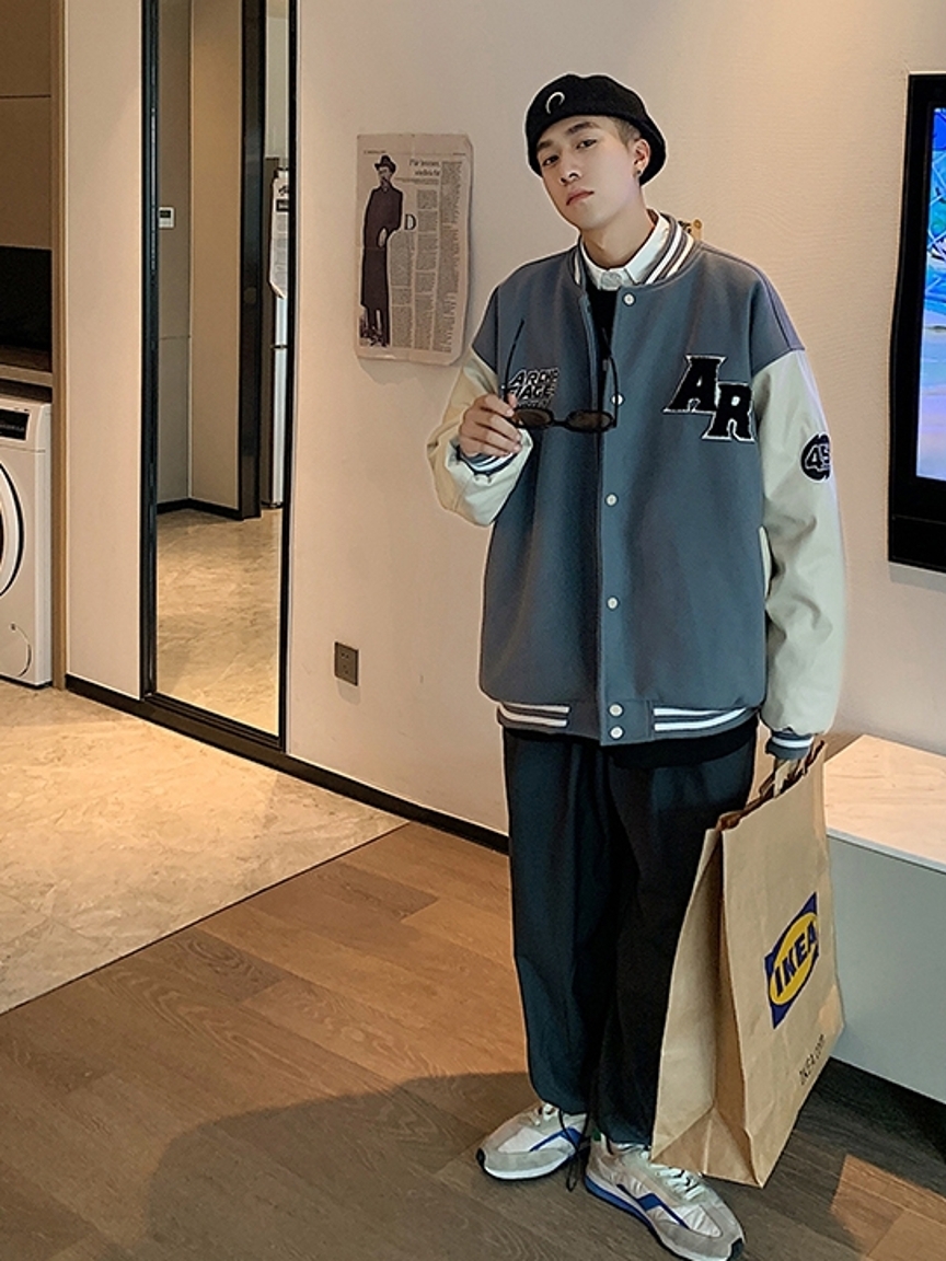 这款撞色棒球服外套在搭配的时候,可以选择一件黑色针织衫作为内搭,再配上一条黑色的运动裤,搭配一双简约的运动鞋,显得很是时髦帅气。