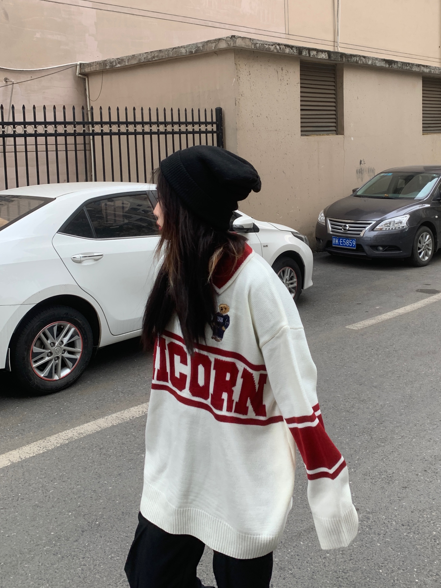 款式简约清新,简单大方的翻领套头设计,精致的小熊刺绣,英文字母点缀衣身,针织面料柔软舒适,甜美百搭。