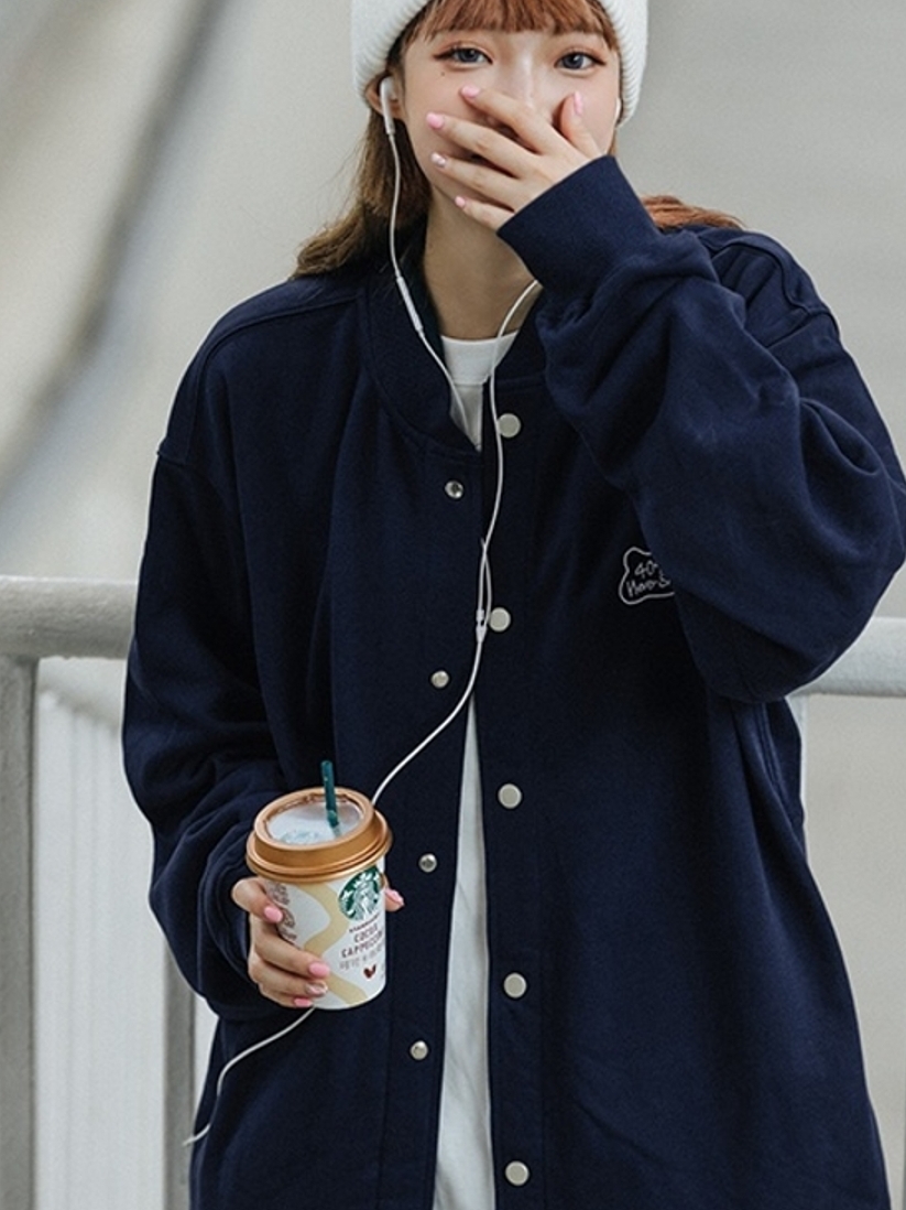 棒球服采用了沉稳大气的深蓝色调,配以简约的棒球立领设计,对颈部的线条具有较好地修饰作用,富有柔软舒适的穿着感受。同时采用了别致的撞色刺绣装饰,打造出时尚简洁大方的气质。门襟采用纽扣的闭合方式,使得穿脱更加方便自如。