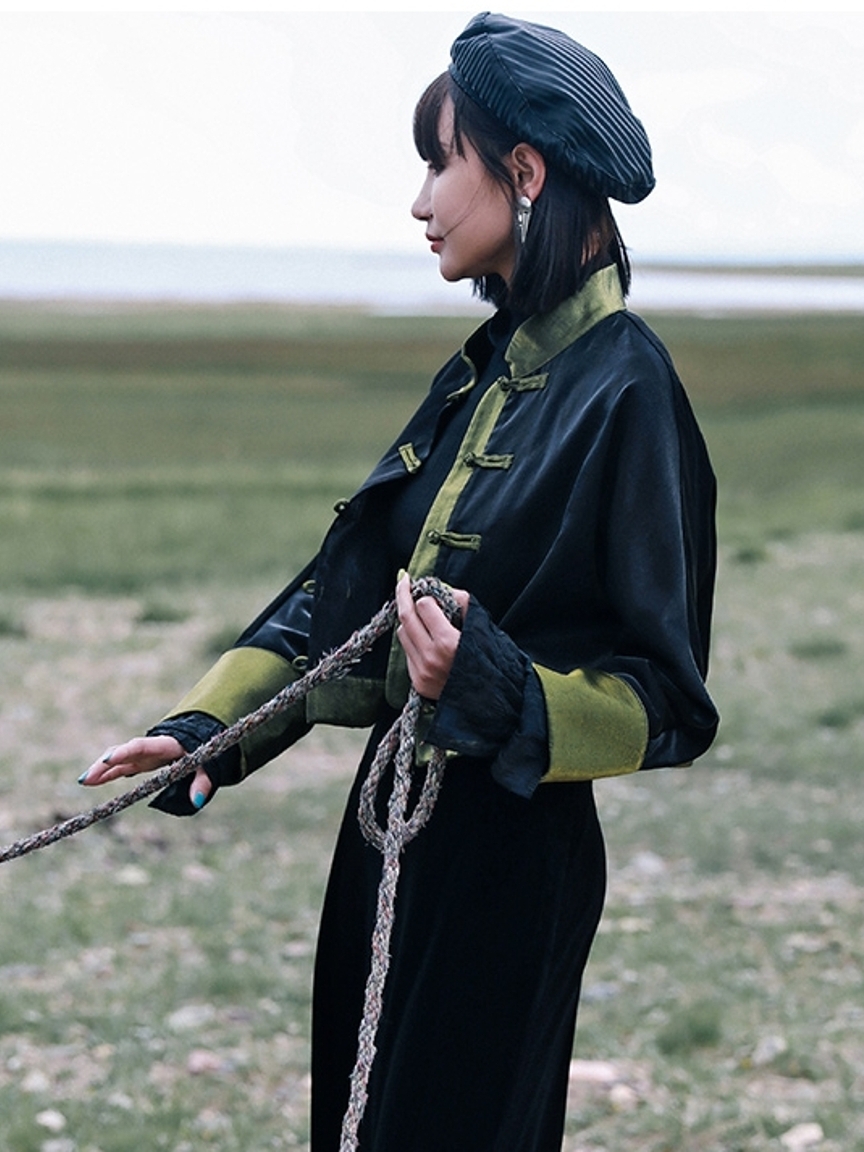 在衣身上做了撞色拼接的设计,具有鲜明的视觉感,增添了不少的亮点,同时盘扣元素点缀,更加的时髦。