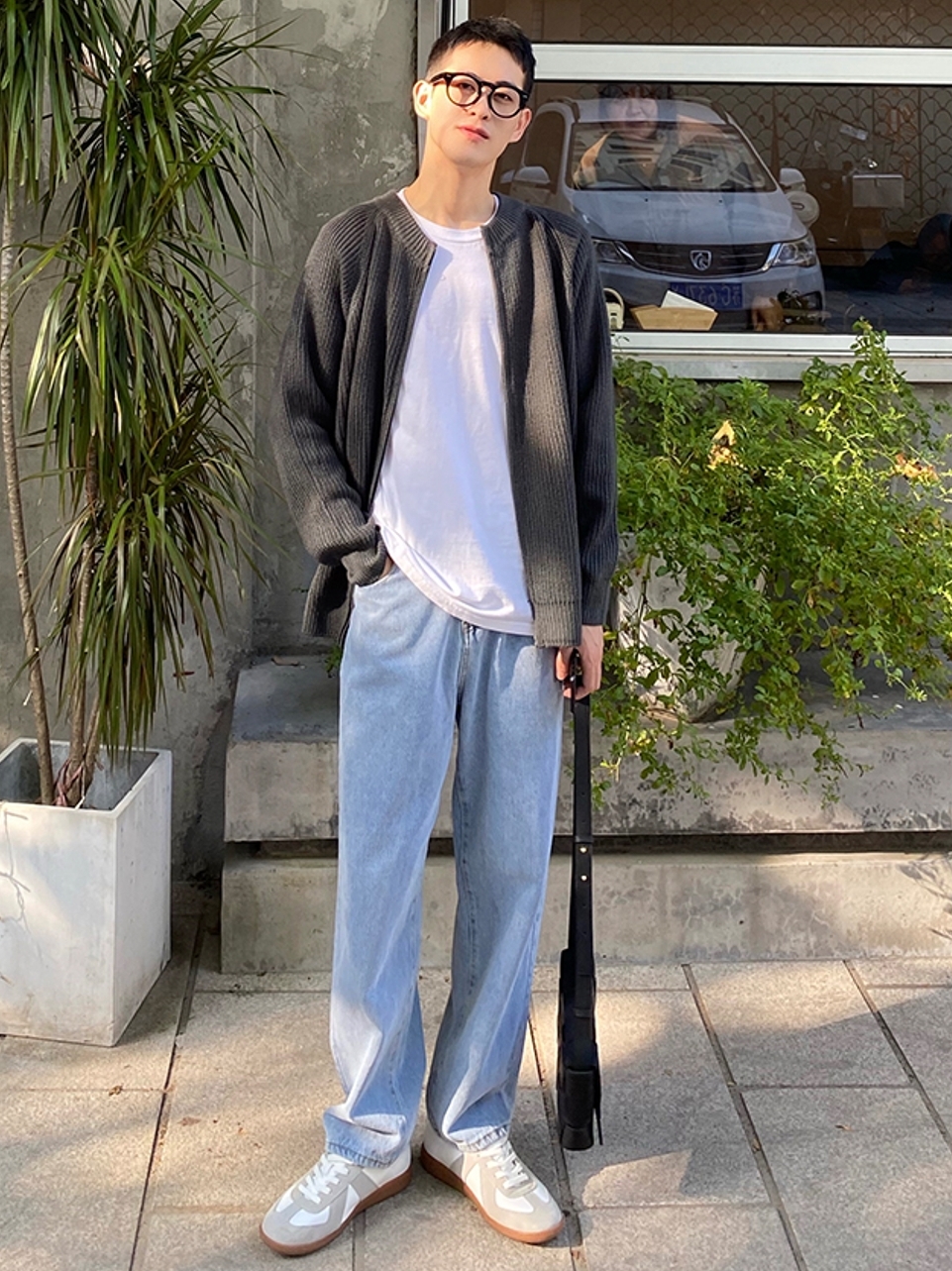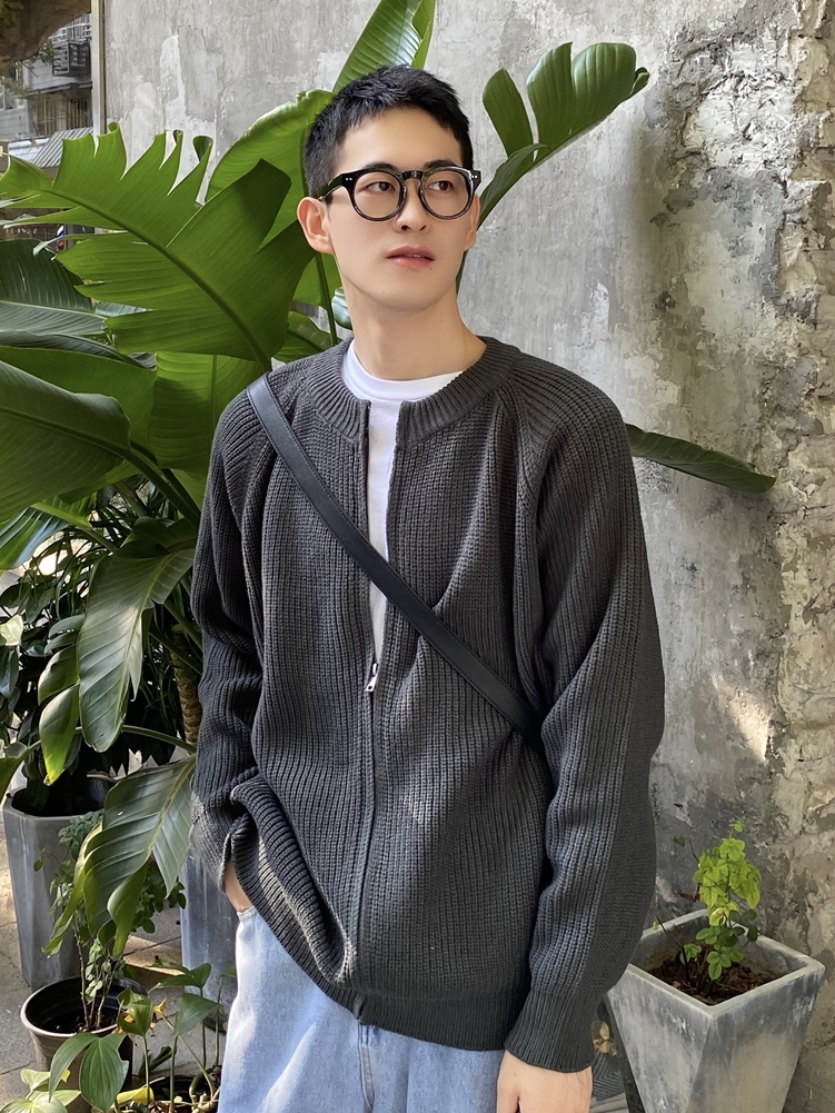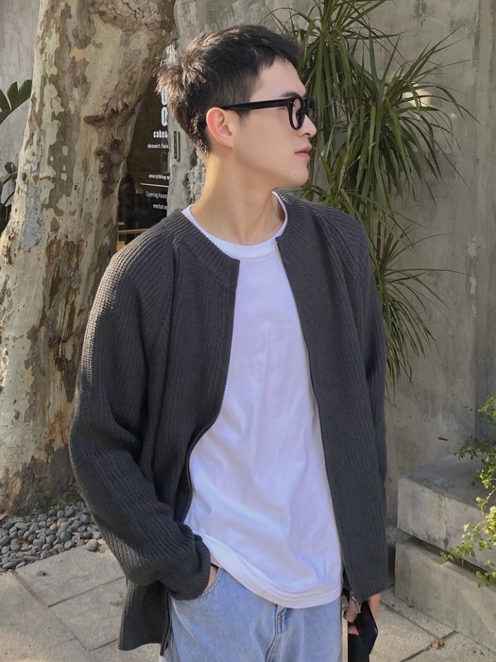 开衫式的一款针织衫,在搭配时,可以选择白色T恤、浅蓝色牛仔裤和小白鞋,整体造型看起来就比较韩范儿哦。
