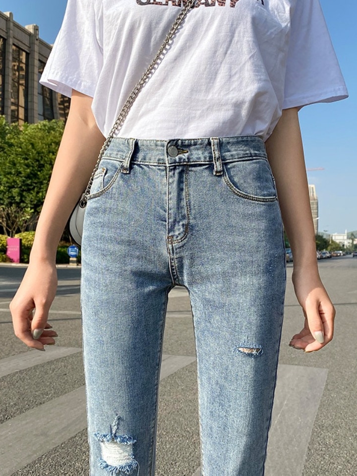 破洞的牛仔长裤,版型偏宽松,休闲的男友风设计,在夏季,浅蓝色看起来更加清凉舒爽,搭配一些单薄的T恤衬衫,都非常好看。
