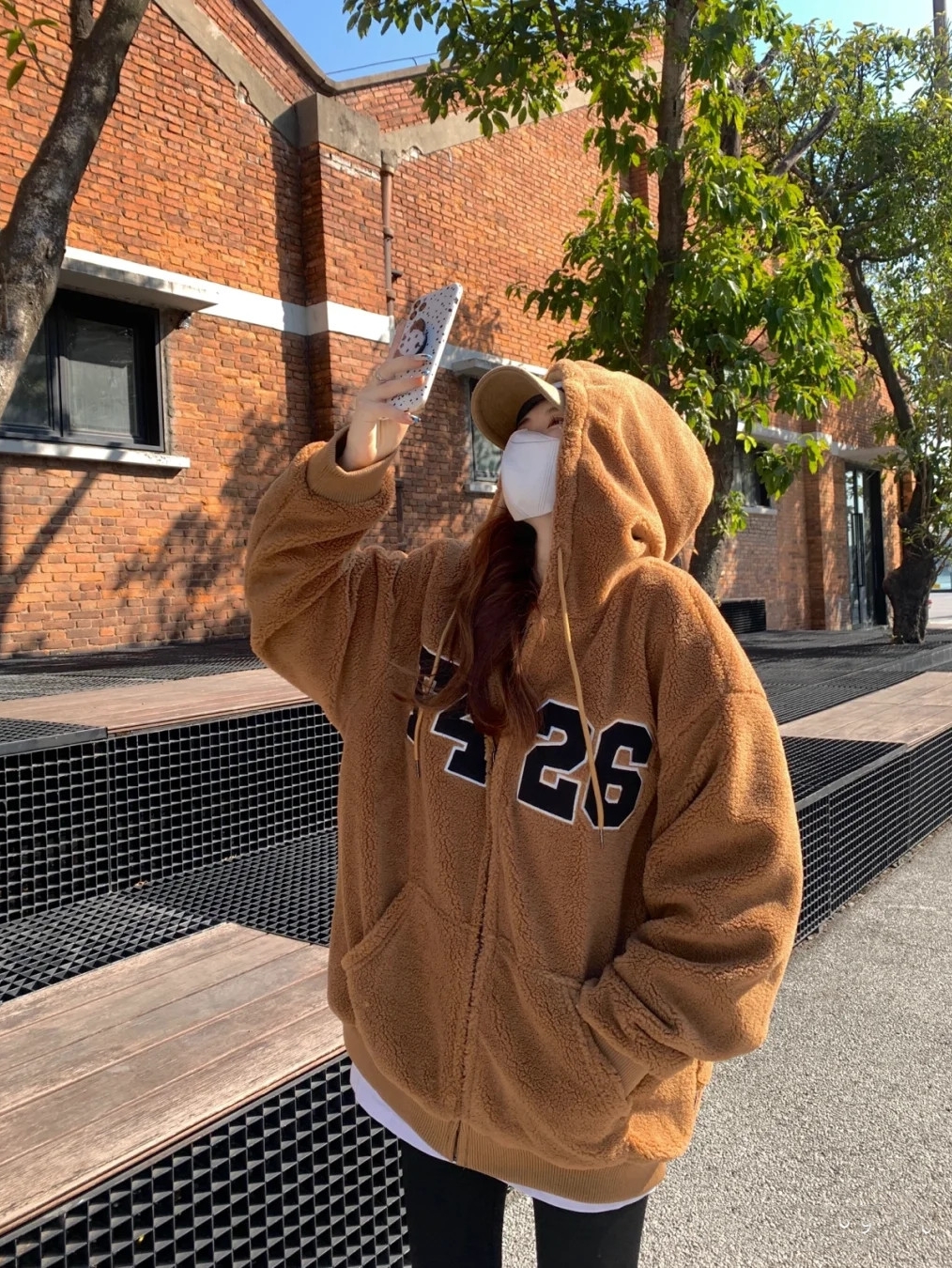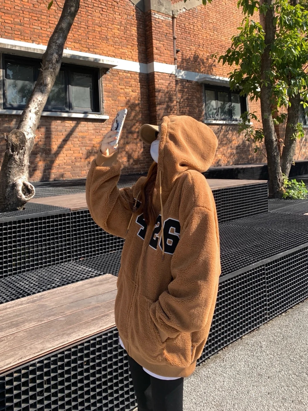甜美的羊羔毛连帽的设计,保暖的同时又充满了少女的气息。袖口可以翻折起与领口相呼应。剪裁线外露的设计,既能修饰背部线条,更能彰显个性。