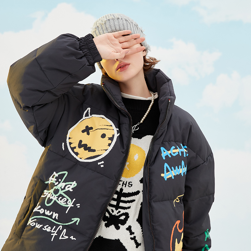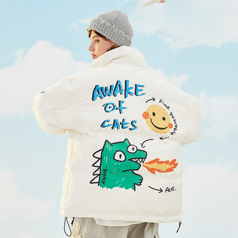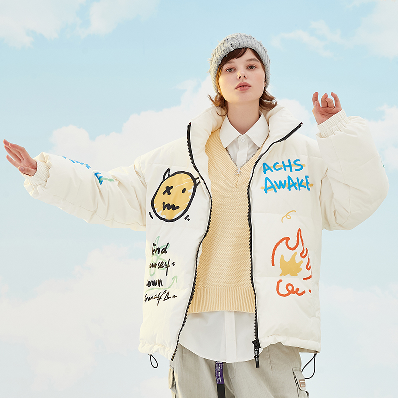 此款羽绒服选用了优质的白鸭绒填充,具有良好的保暖性能,衣身以时尚的印花图案点缀,彰显青春活力气息,上身效果极佳,连帽的设计,防风保暖。