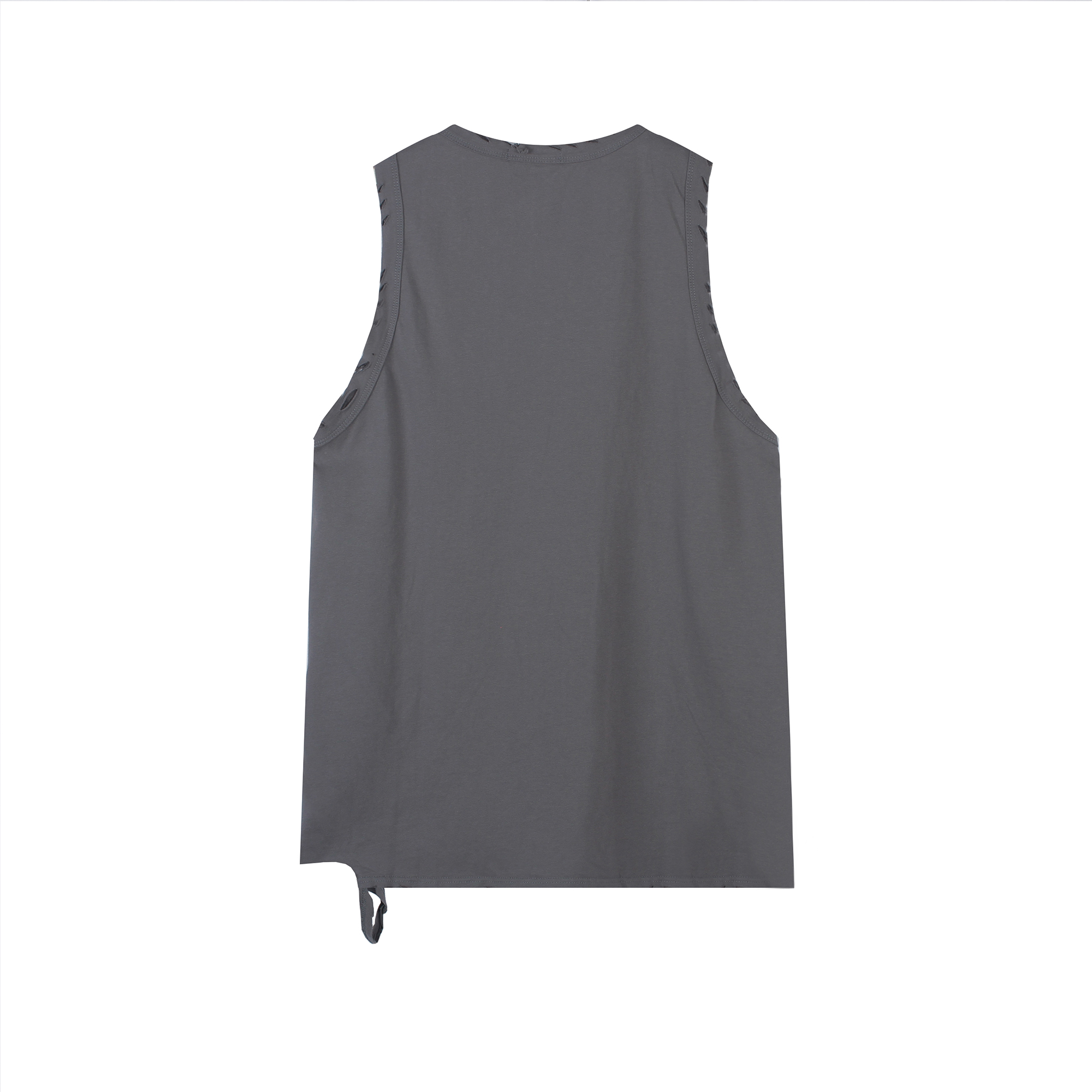 宽松版型,穿着舒适自在,胸前破洞设计,个性十足,纯色的色调,简约又百搭,无袖设计,修饰手臂线条,宽松t恤,让你轻松驾驭。