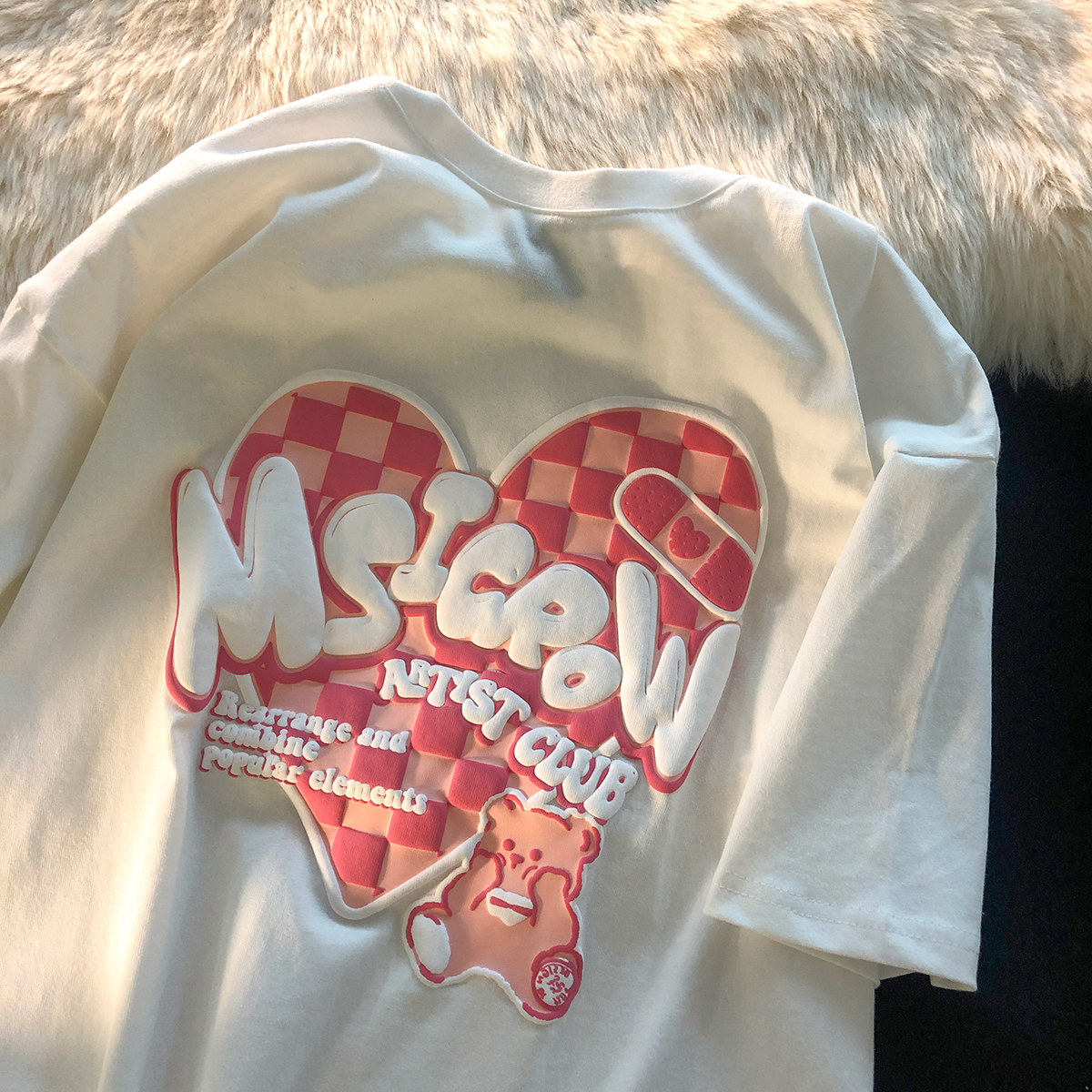 短袖设计,修饰手臂线条。原创设计,让你彰显个性。宽松版型,穿着舒适自在。