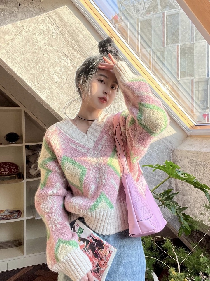 宽松版型的套头毛衣,oversized廓形不挑身材,穿着舒适慵懒,大V领的设计修饰脖颈线条,衬托出精致小脸,显瘦蝙蝠袖的设计随性自在,宽边的螺纹下摆及袖口,穿着舒适有型。