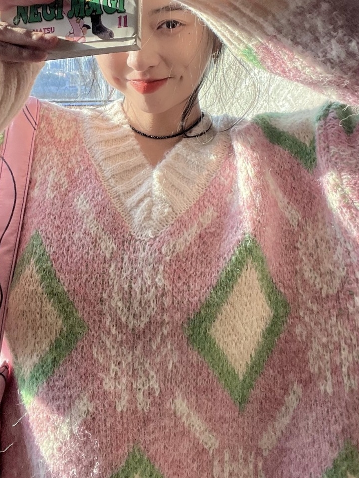 采用经典的V字领设计,露出锁骨线条和修长脖颈,十分性感优雅,棕色系的设计很有温暖的味道,采用菱形格纹的设计,充满了复古的摩登气息,整体风格极具慵懒随性的气质。