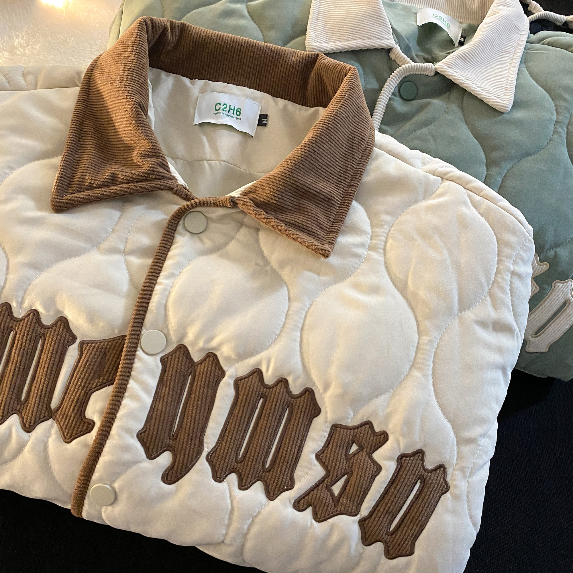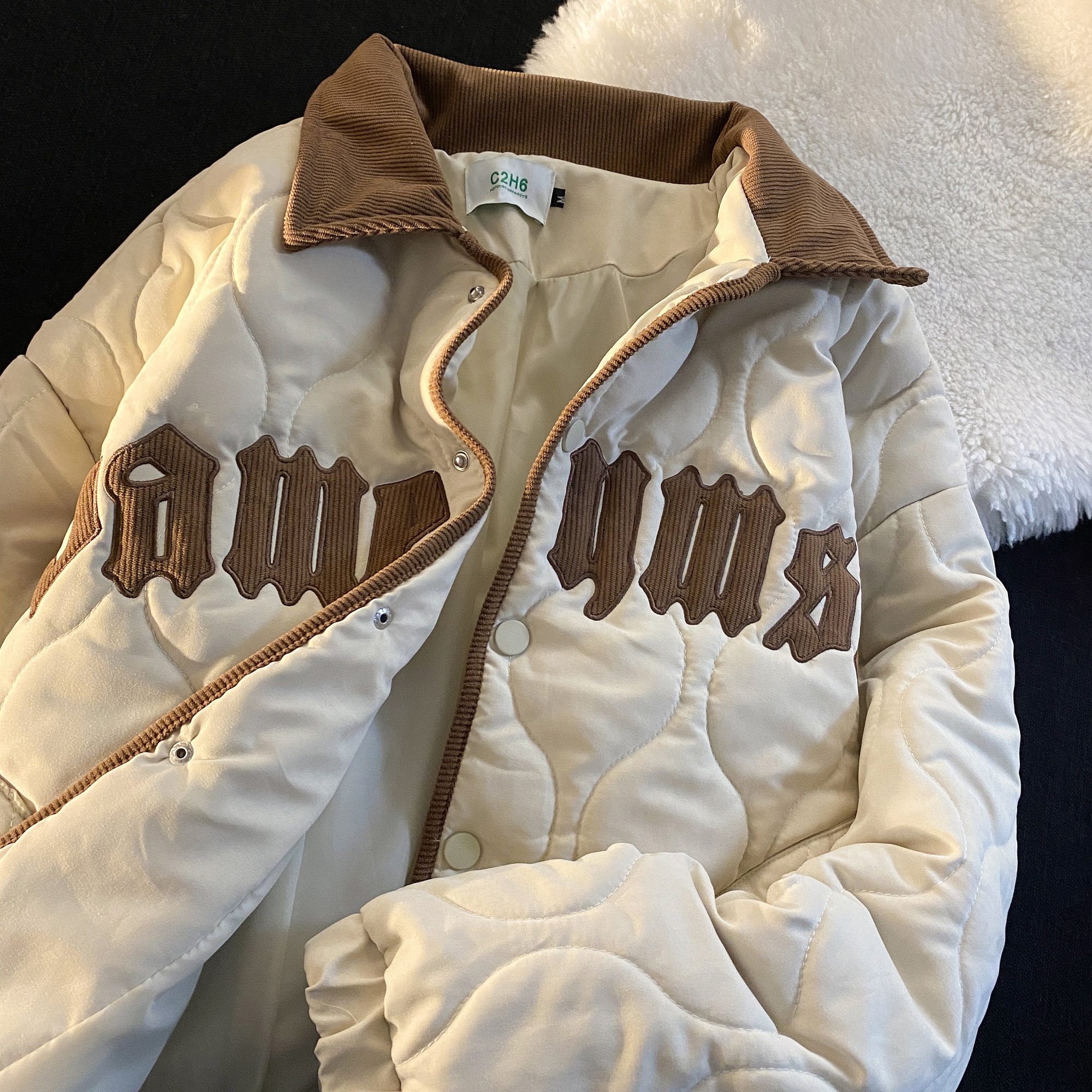 宽松的版型,上身很显瘦,短款外套,拉长身材比例,棉衣设计,穿着舒适保暖。