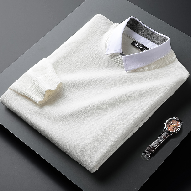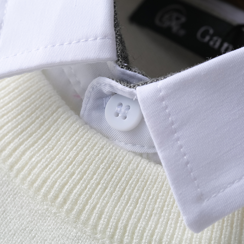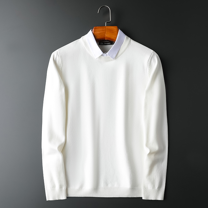毛衣设计,穿着舒适保暖。经典圆领设计,简约大方。假两件设计,丰富层次感。