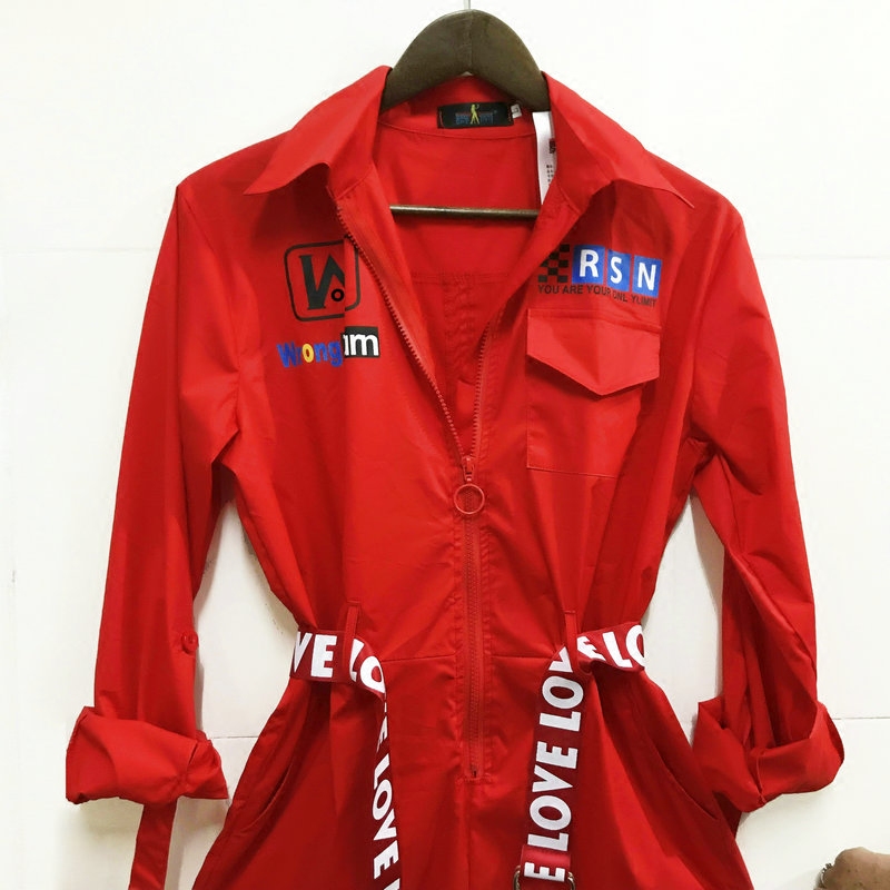 收腰设计,凸显纤细腰身,连体裤版型,显瘦显腿长,宽松版型,穿着舒适自在,红色的色调,时尚感十足。