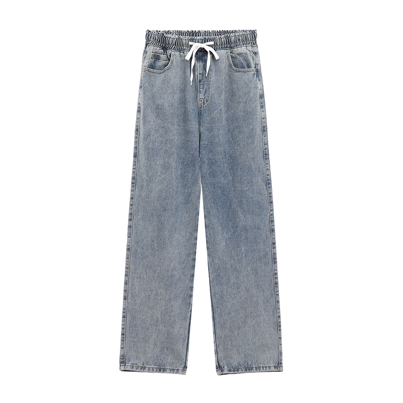 宽松直筒裤型,修身显瘦,水洗做旧工艺,复古怀旧,简约款式,休闲时尚百搭,松紧腰设计,穿脱更方便,经典复古风格,时尚潮流。