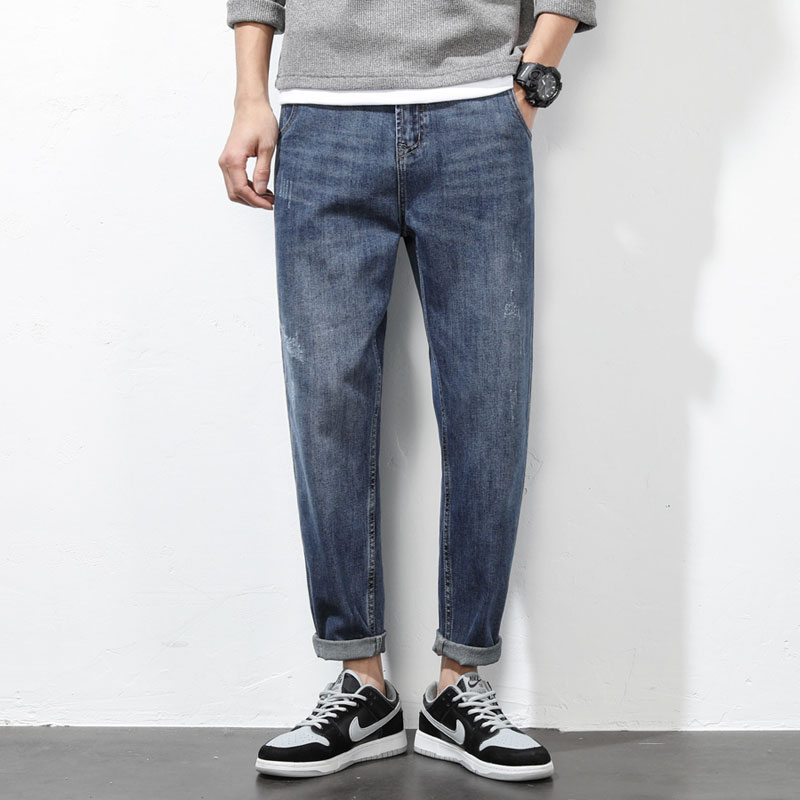 高腰设计,拉长身材比例。高腰牛仔裤,显瘦显腿长。直筒裤型,修饰腿部线条。