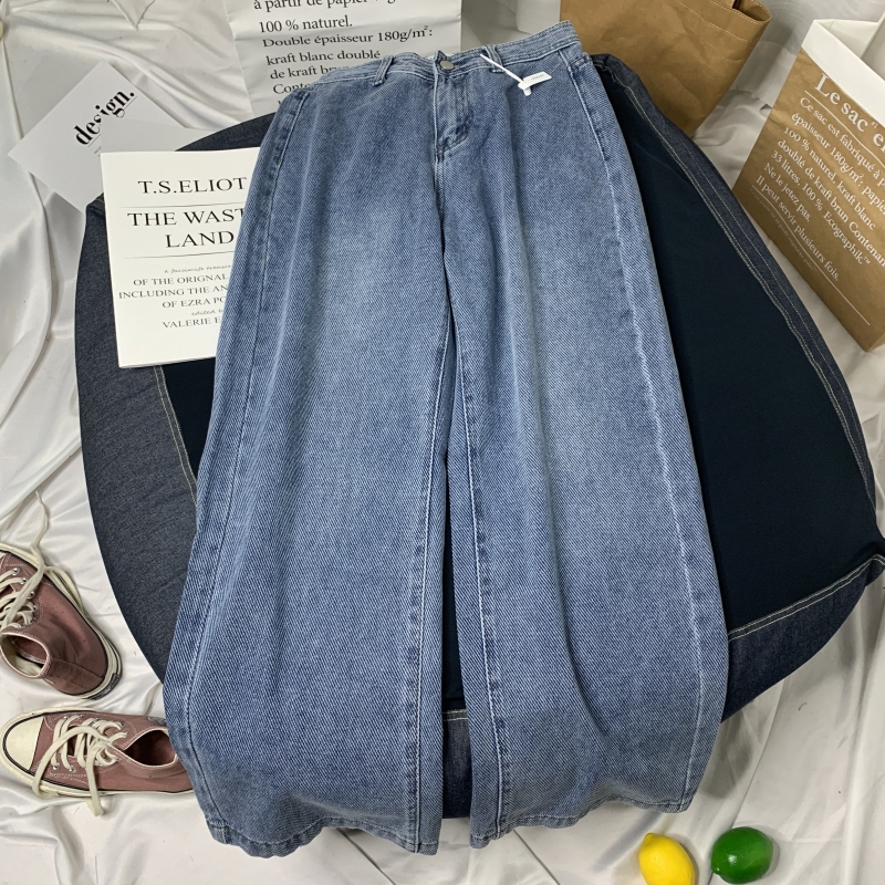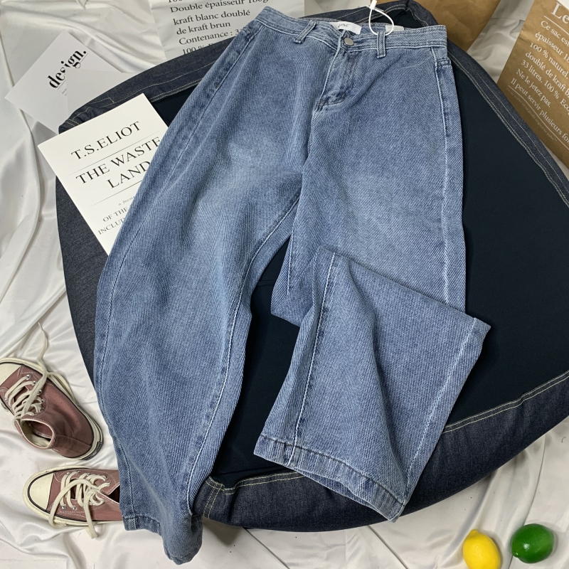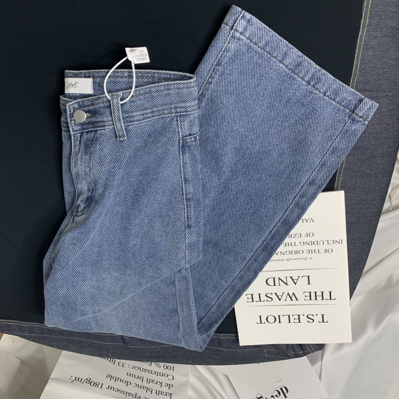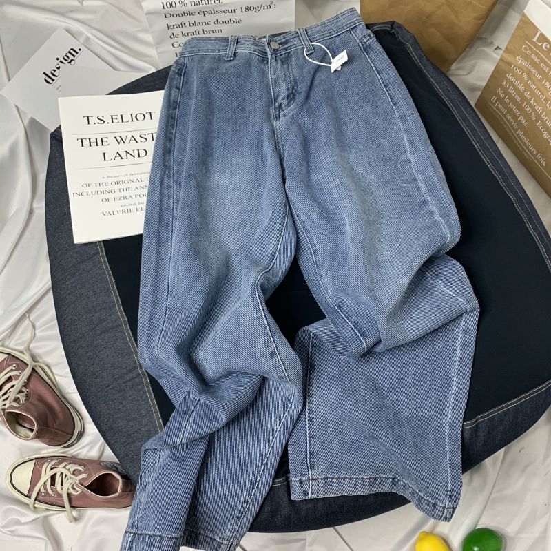 高腰设计,拉长身材比例。高腰牛仔裤,显瘦显腿长。直筒裤型,修饰腿部线条。
