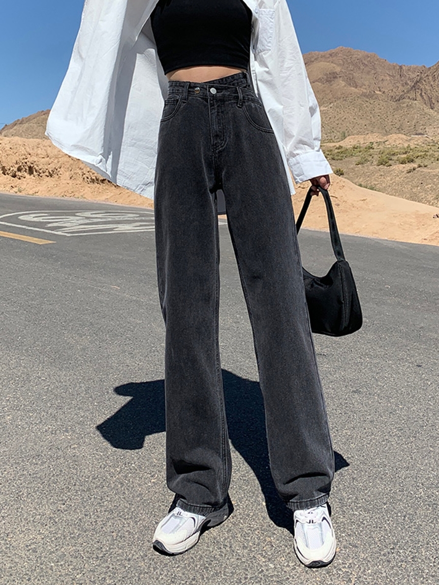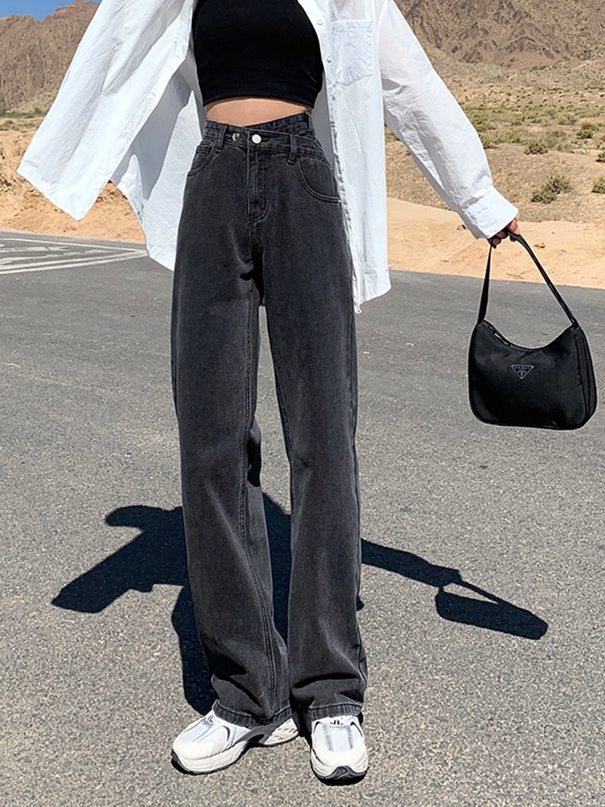 高腰设计,拉长身材比例。高腰牛仔裤,显瘦显腿长。直筒裤型,修饰腿部线条。