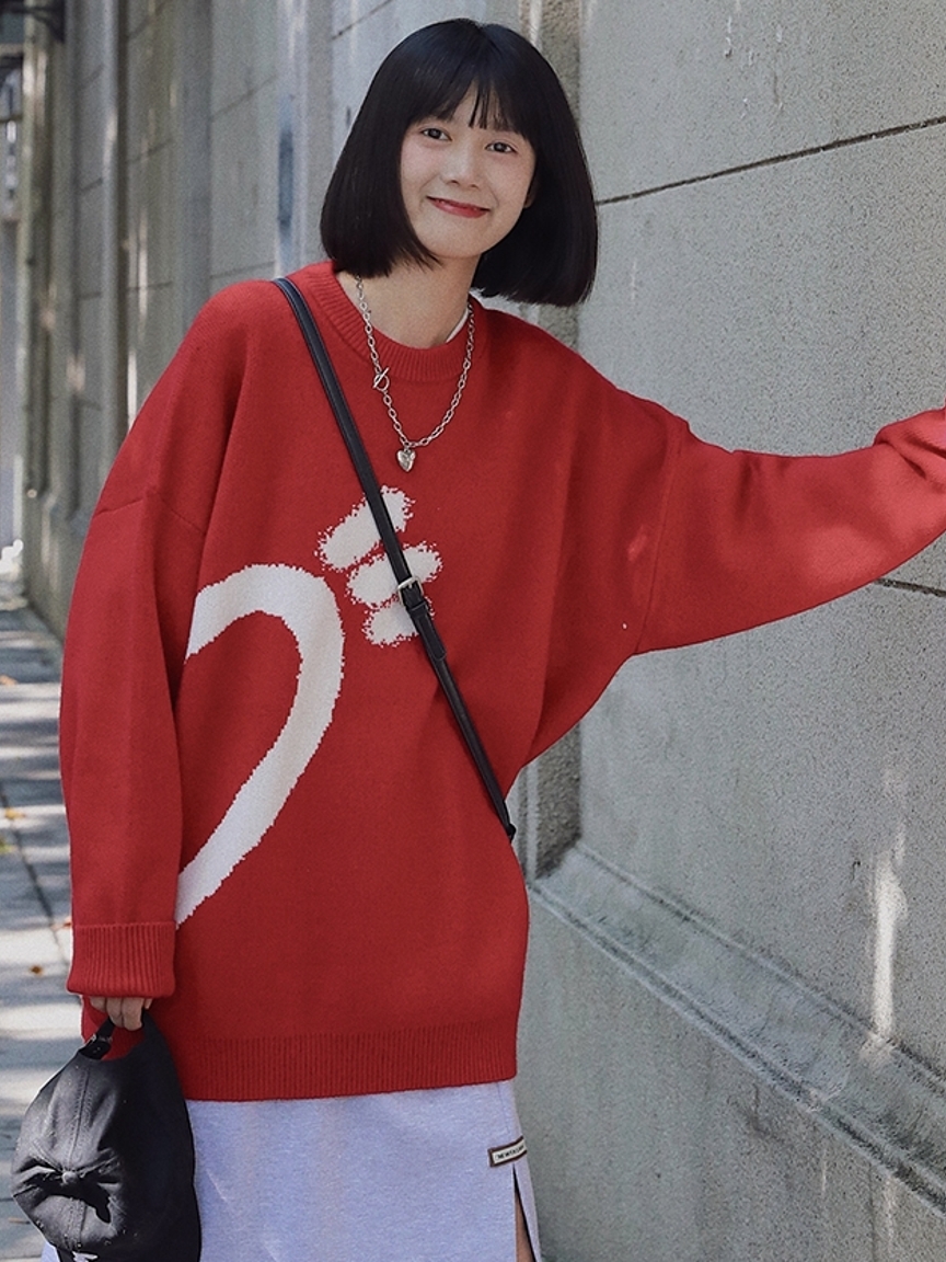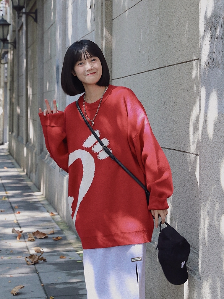 胸前别致的桃心图案,点缀衣身,打破了纯色系的单调感,丰富了衣服的视觉效果,让简约的毛衣也不失设计感。
