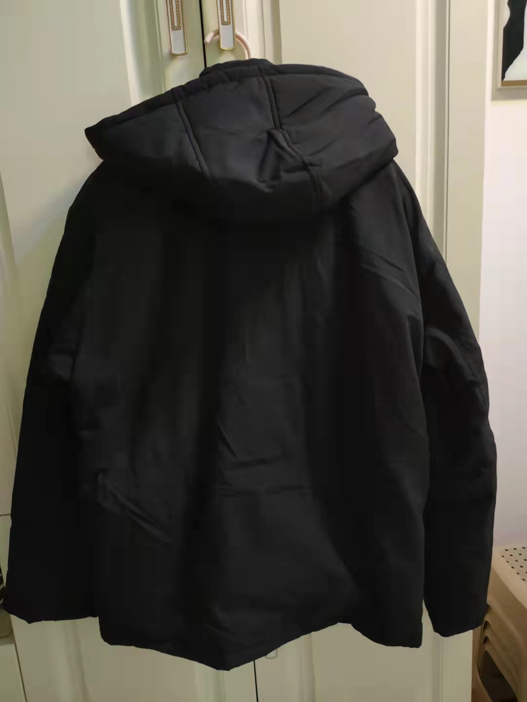 短款外套,拉长身材比例,黑色的色调,经典又百搭,连帽设计,防风保暖性好,加厚厚实,保暖效果极佳。