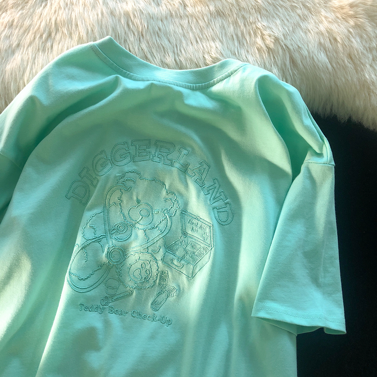 短袖设计,修饰手臂线条,胸前小熊刺绣,俏皮可爱。