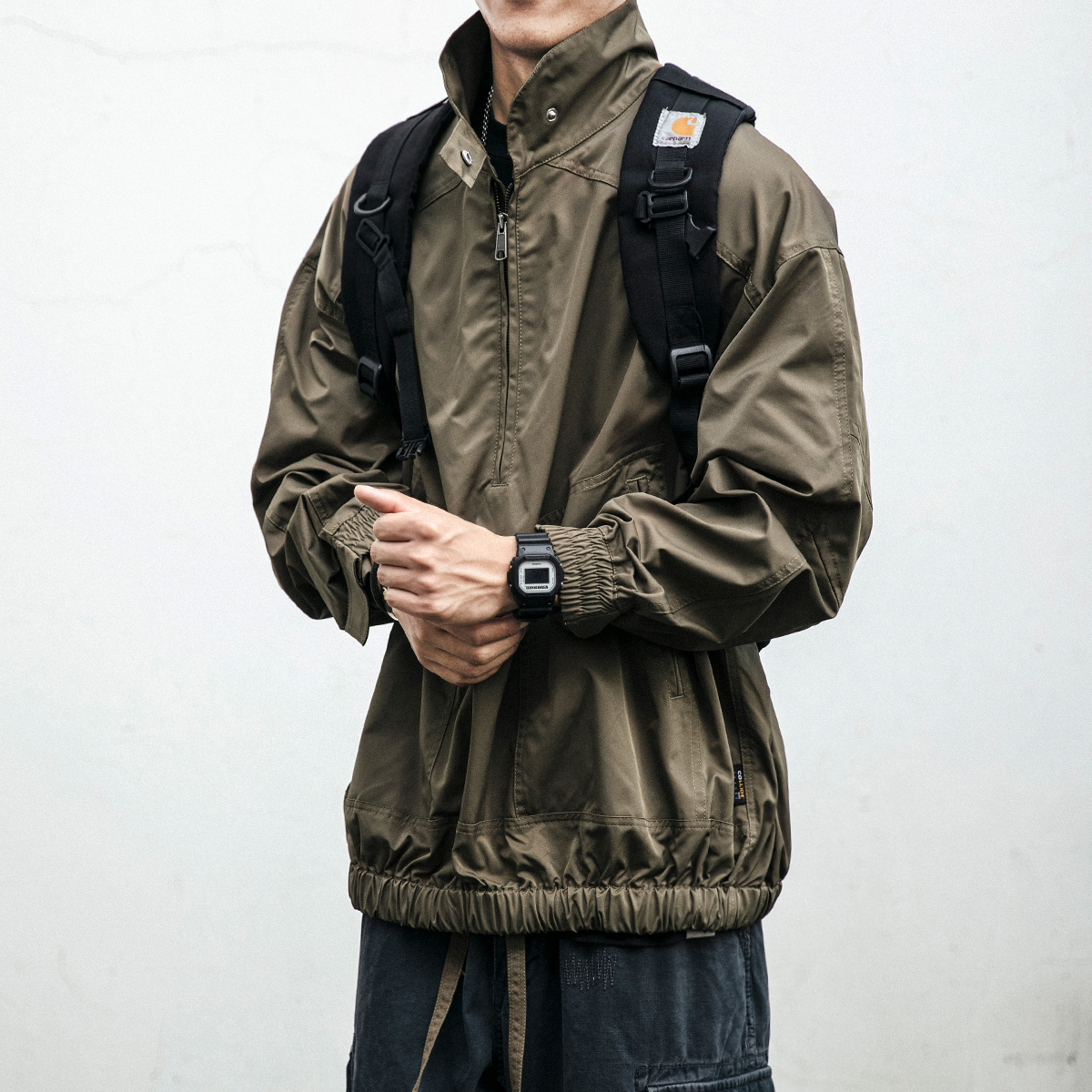 夹克版型,穿着帅气有型,多口袋设计,工装风十足,宽松版型,穿着舒适自在,短款外套,拉长身材比例,经典复古风格,时尚潮流。
