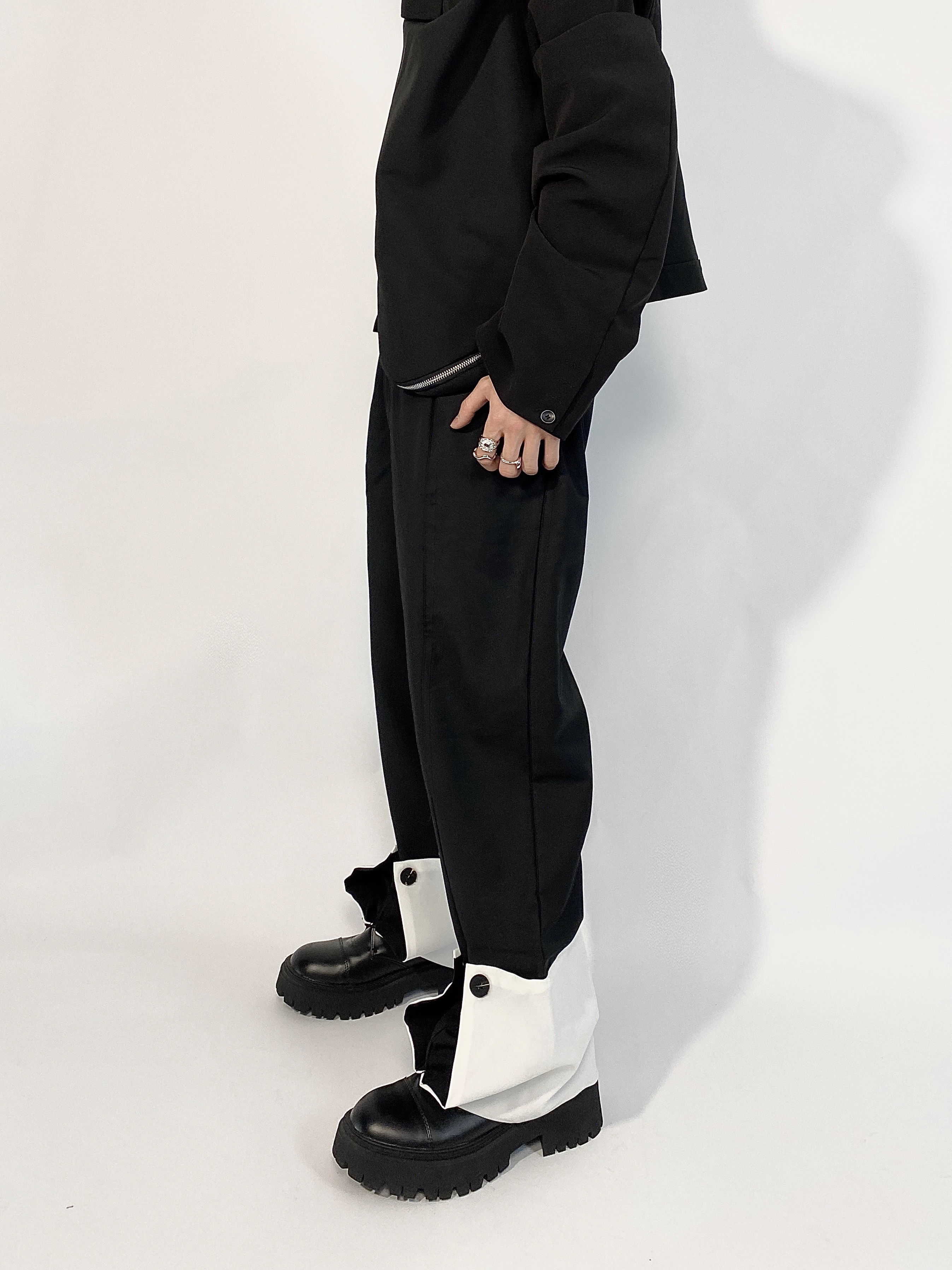 高腰的设计,拉长腿部线条,显瘦效果很好,高腰的版型,很显高挑,修身的剪裁,修饰腿部曲线,上身很有范。