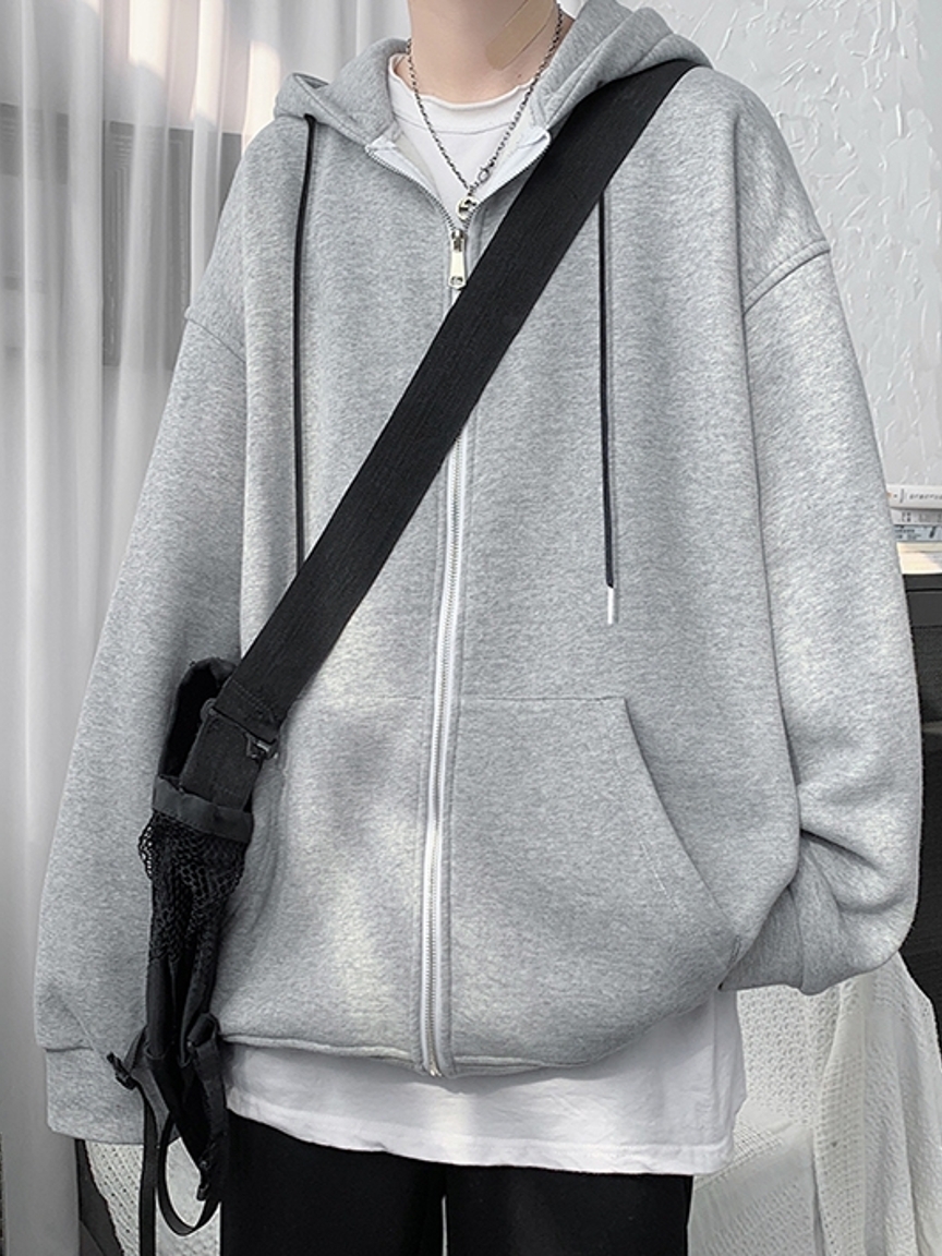 一款休闲时尚的灰色拉链开衫外套,连帽的款式设计,丰富了衣身的层次感,穿上显得很是青春时尚。