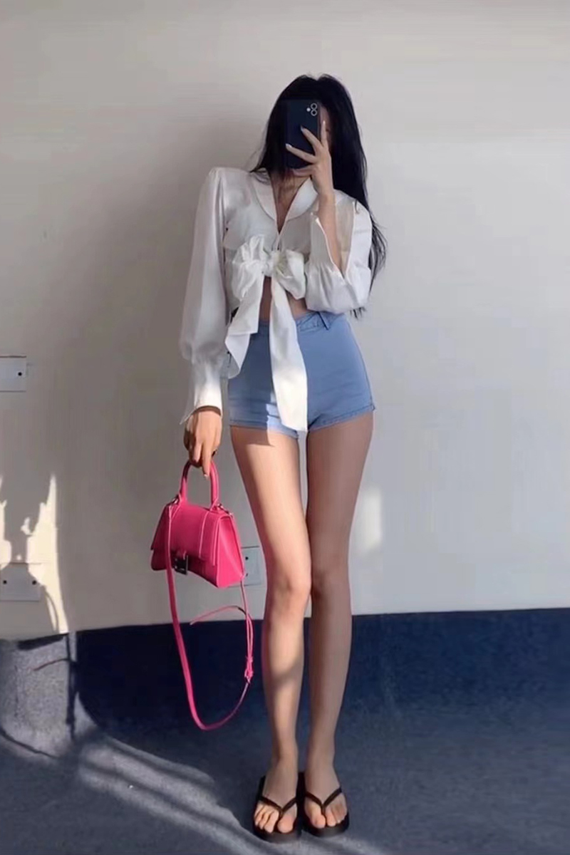 短裤采用了牛仔面料,穿着舒适,高腰的设计,拉长腿部线条,显瘦效果很好,修身的版型,很显身材,搭配一件T恤,就能轻松穿出时尚感。