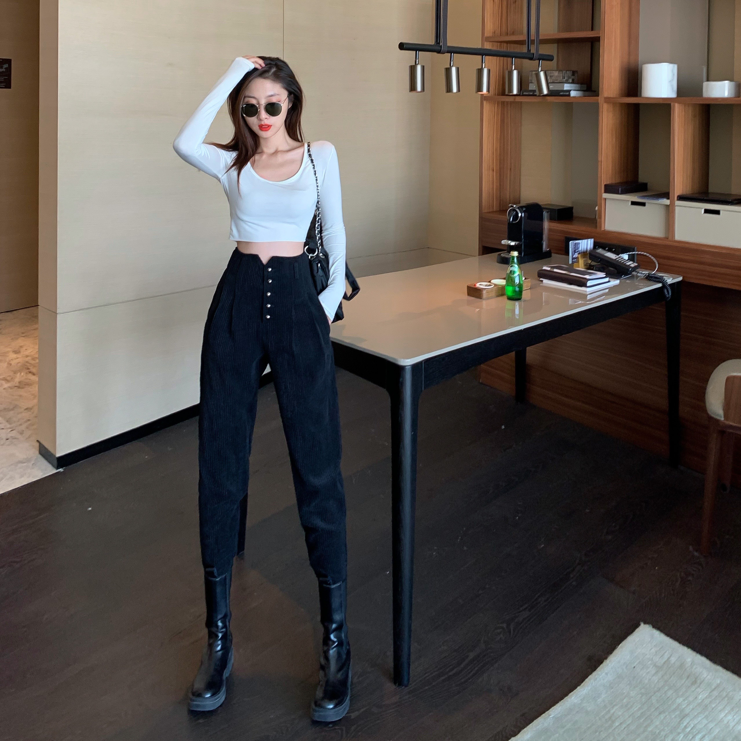 高腰的设计,拉长腿部线条,显瘦效果很好,高腰的版型,很显高挑,修身的剪裁,修饰腿部曲线,上身很有范。