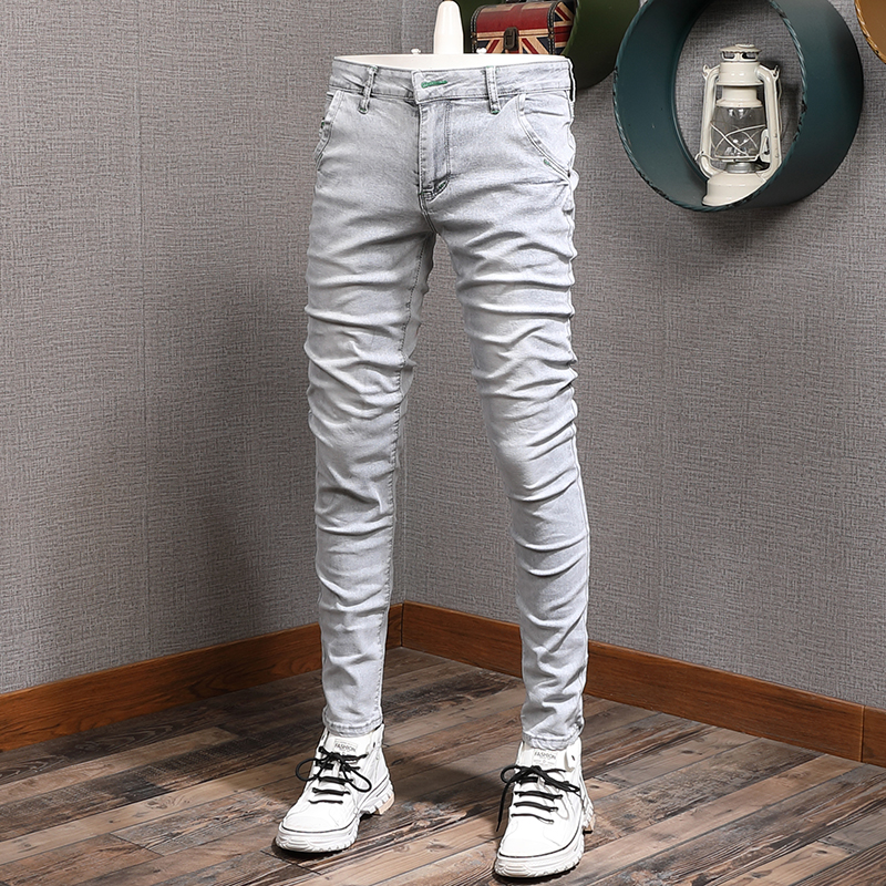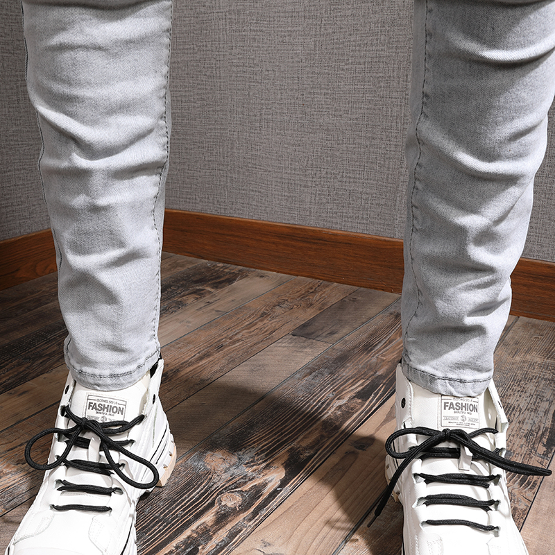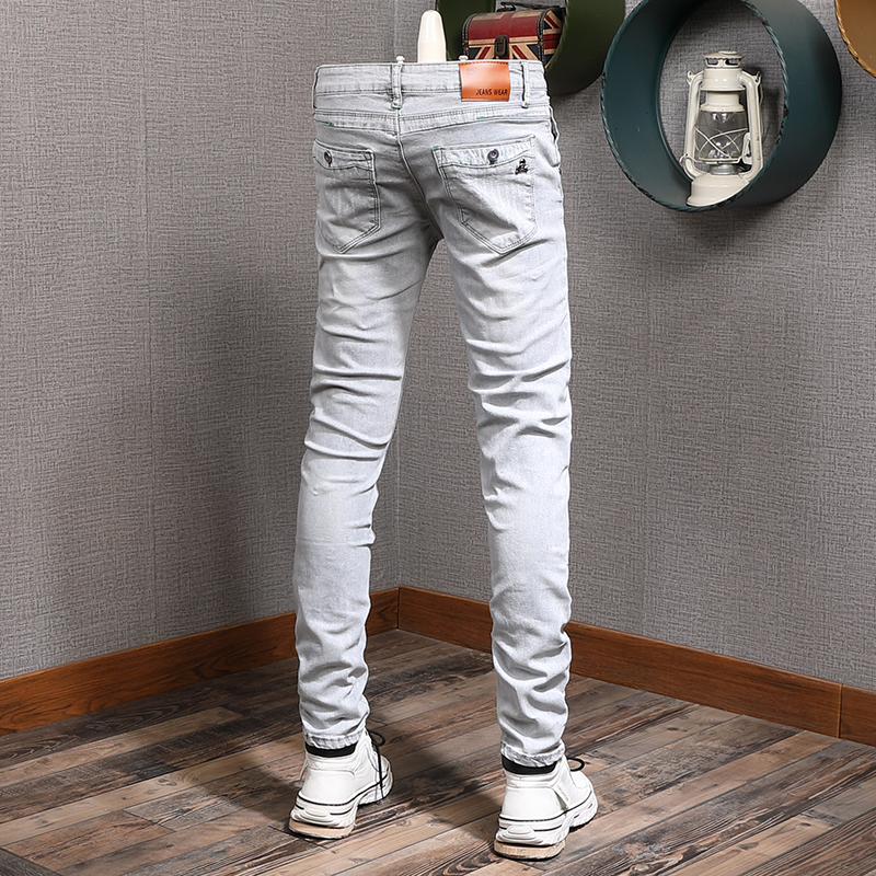小脚裤型,修饰腿部线条。修身版型,凸显身材曲线。牛仔裤,穿着舒适不紧绷。