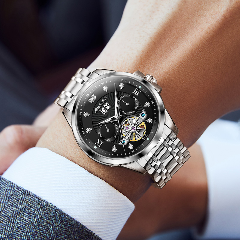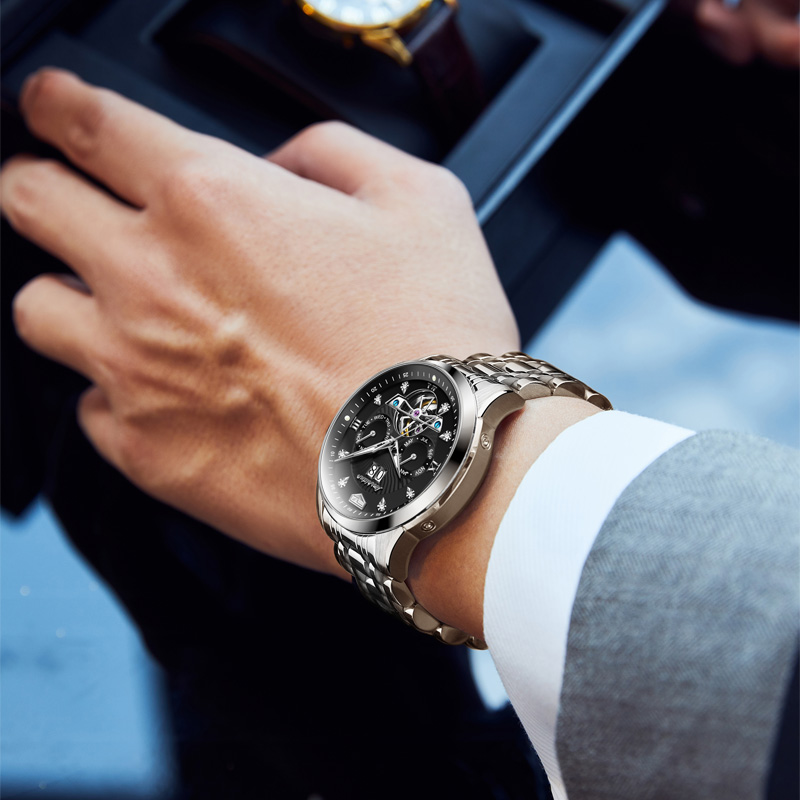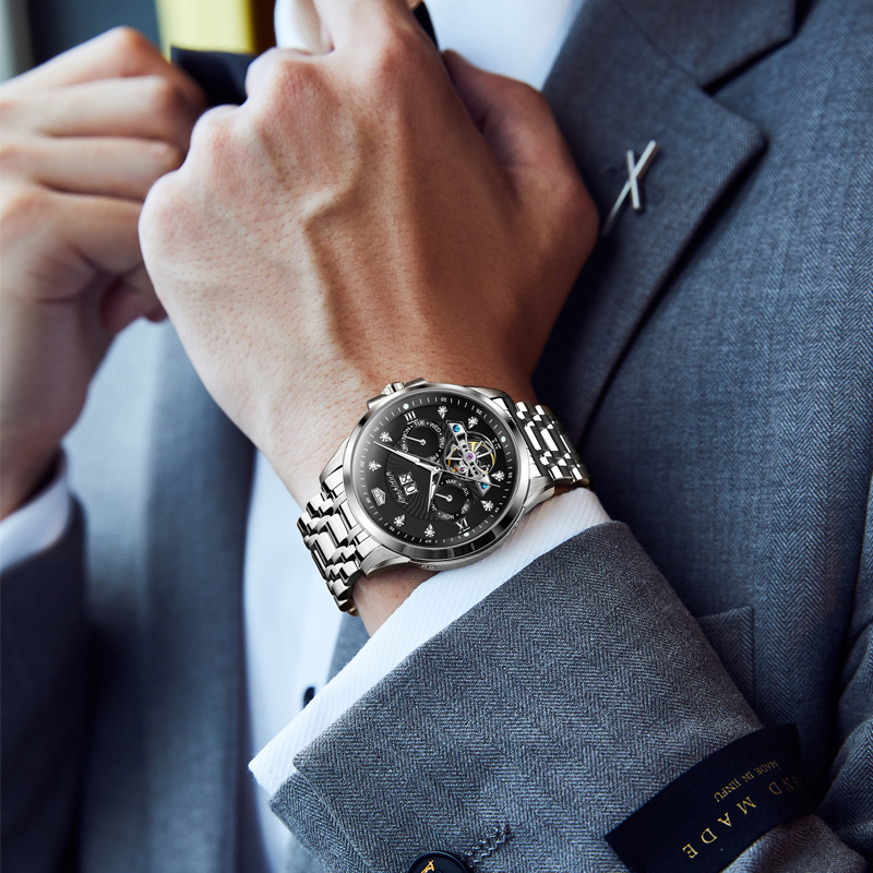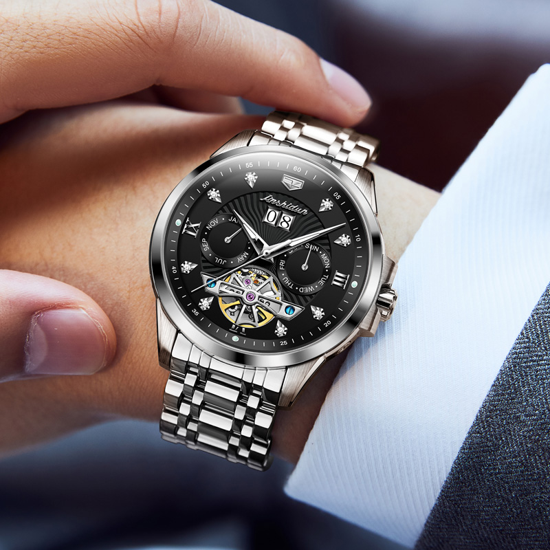 不锈钢表壳和表带材质,防水性能好,且佩戴舒适。人工合成蓝宝石表镜,防刮耐磨。