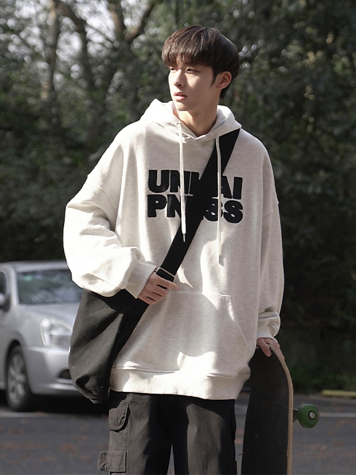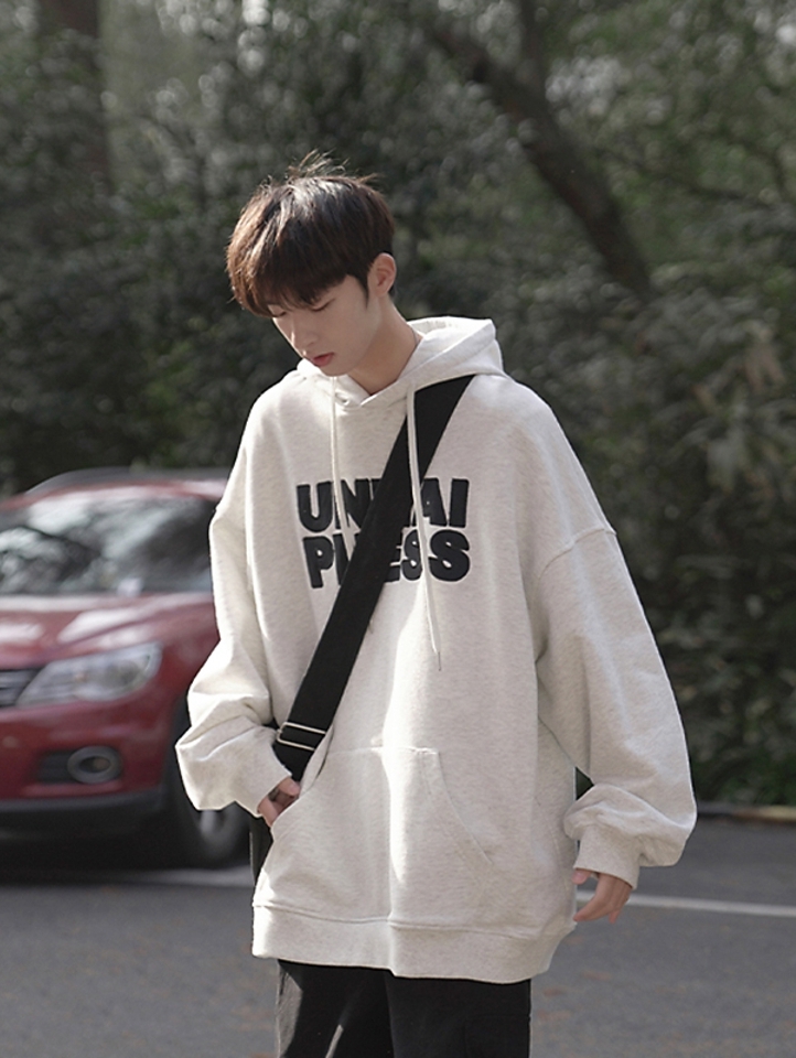 很百搭的白灰色卫衣,连帽的设计充满了安全感。宽松的直身版型,慵懒的落肩袖设计,街头感十足,又很特别,非常好搭配。两侧实用的袋鼠兜,也可以很好的凹造型。