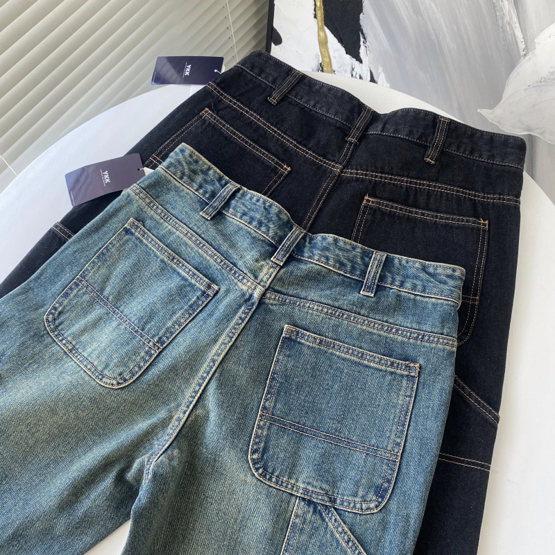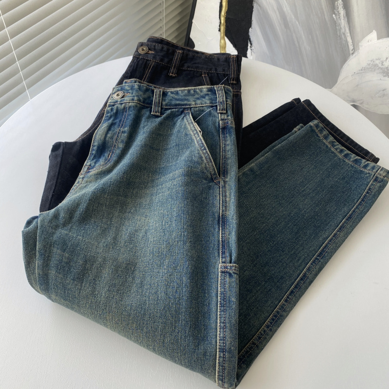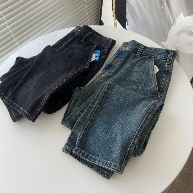 高腰设计,拉长身材比例。高腰牛仔裤,显瘦显腿长。直筒裤型,修饰腿部线条。