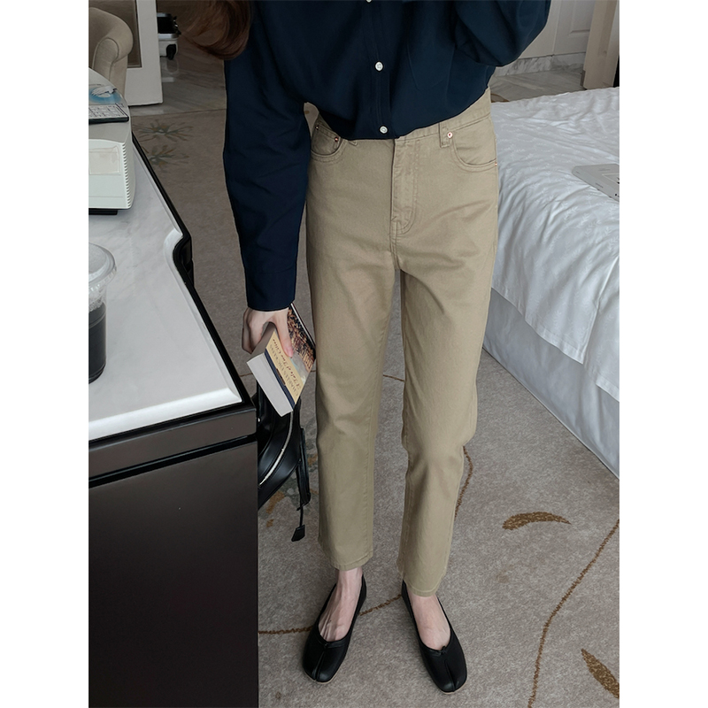高腰设计,拉长身材比例。高腰牛仔裤,显瘦显腿长。直筒裤型,修饰腿部线条。