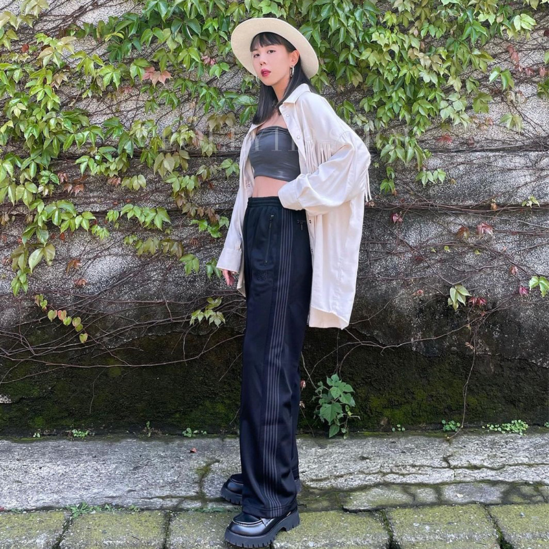 高腰的设计,拉长腿部线条,显瘦效果很好,高腰的版型,很显高挑,修身的剪裁,修饰腿部曲线,上身很有范。