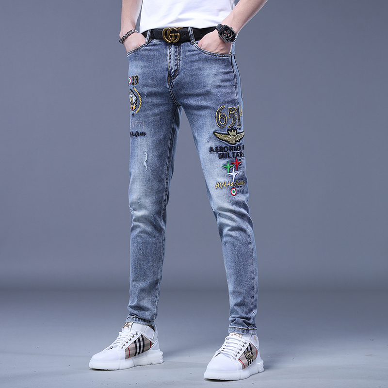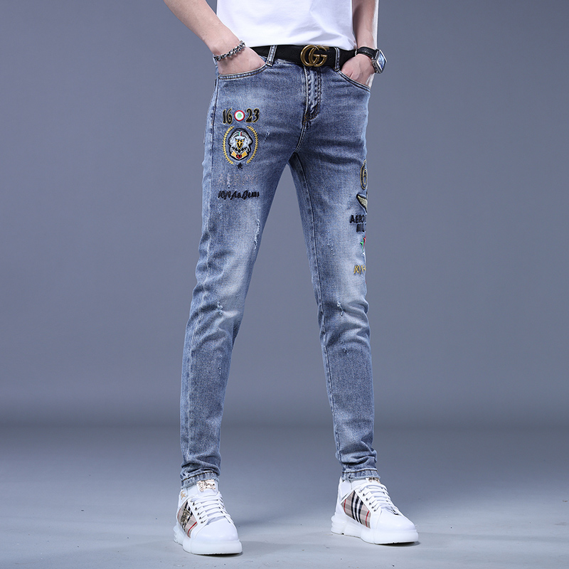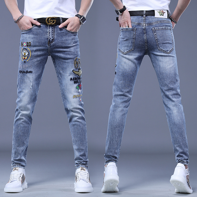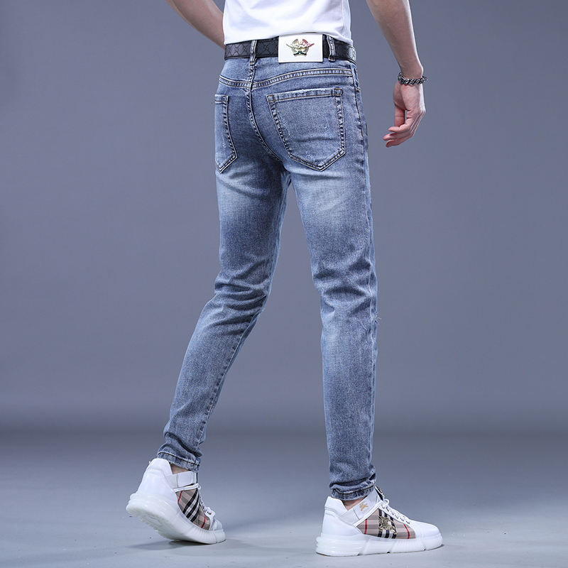 牛仔裤采用优质的牛仔面料,手感柔软,穿着舒适,修身的版型设计,上身效果很好,搭配上一双小白鞋,帅气十足。