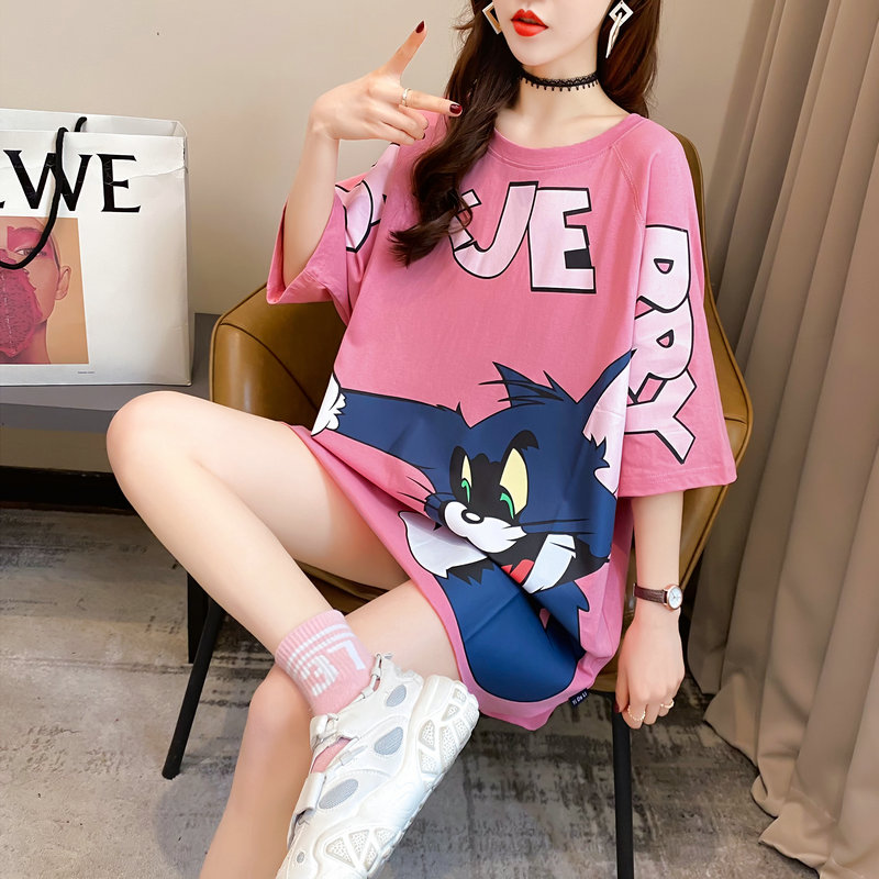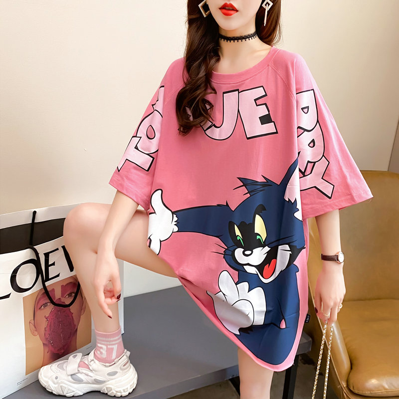 卡通印花图案,萌趣可爱,中长款的版型,修饰身材,宽松t恤,让你轻松驾驭,短袖设计,修饰手臂线条,可爱卡通印花,萌趣十足。