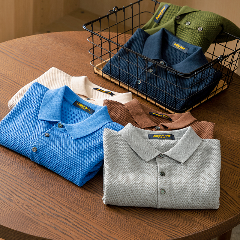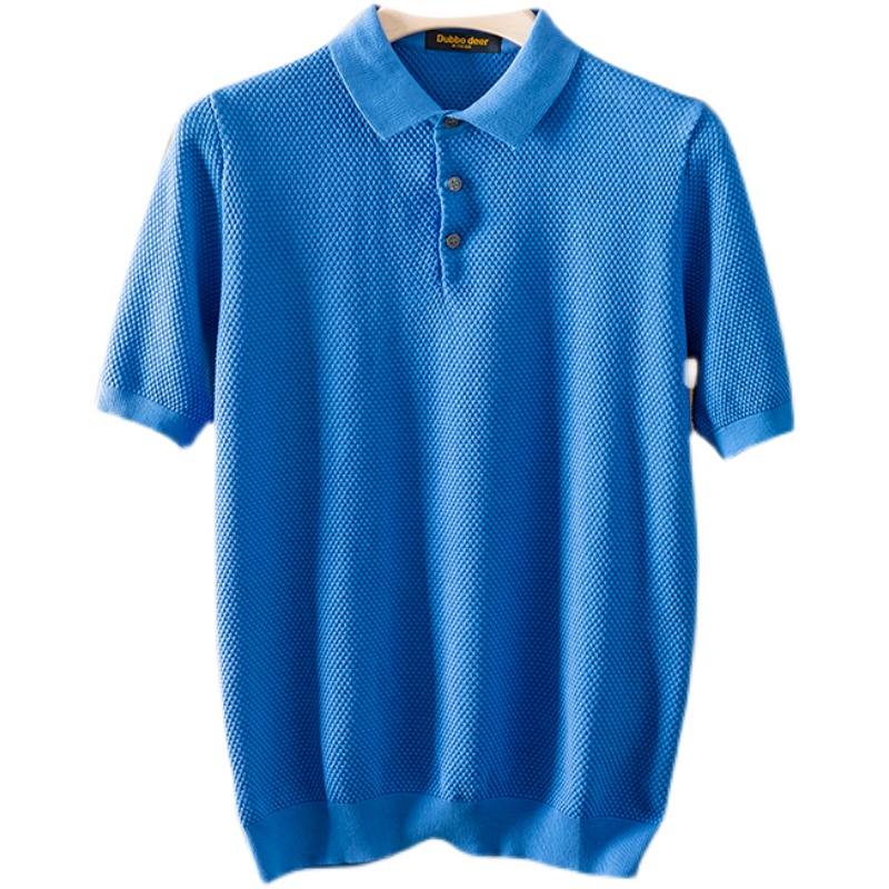 翻领设计,修饰颈部线条。短袖设计,修饰手臂线条。针织材质,穿着舒适透气。