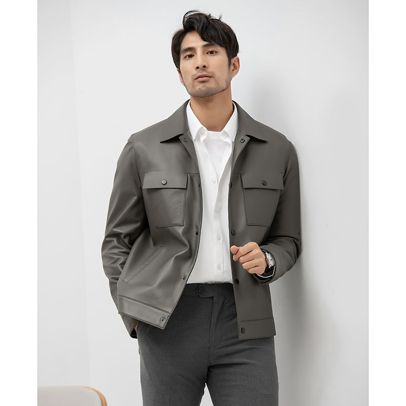 绵羊皮材质,柔软又舒适,夹克版型,穿着帅气有型,短款外套,拉长身材比例,翻领设计,彰显男士魅力。