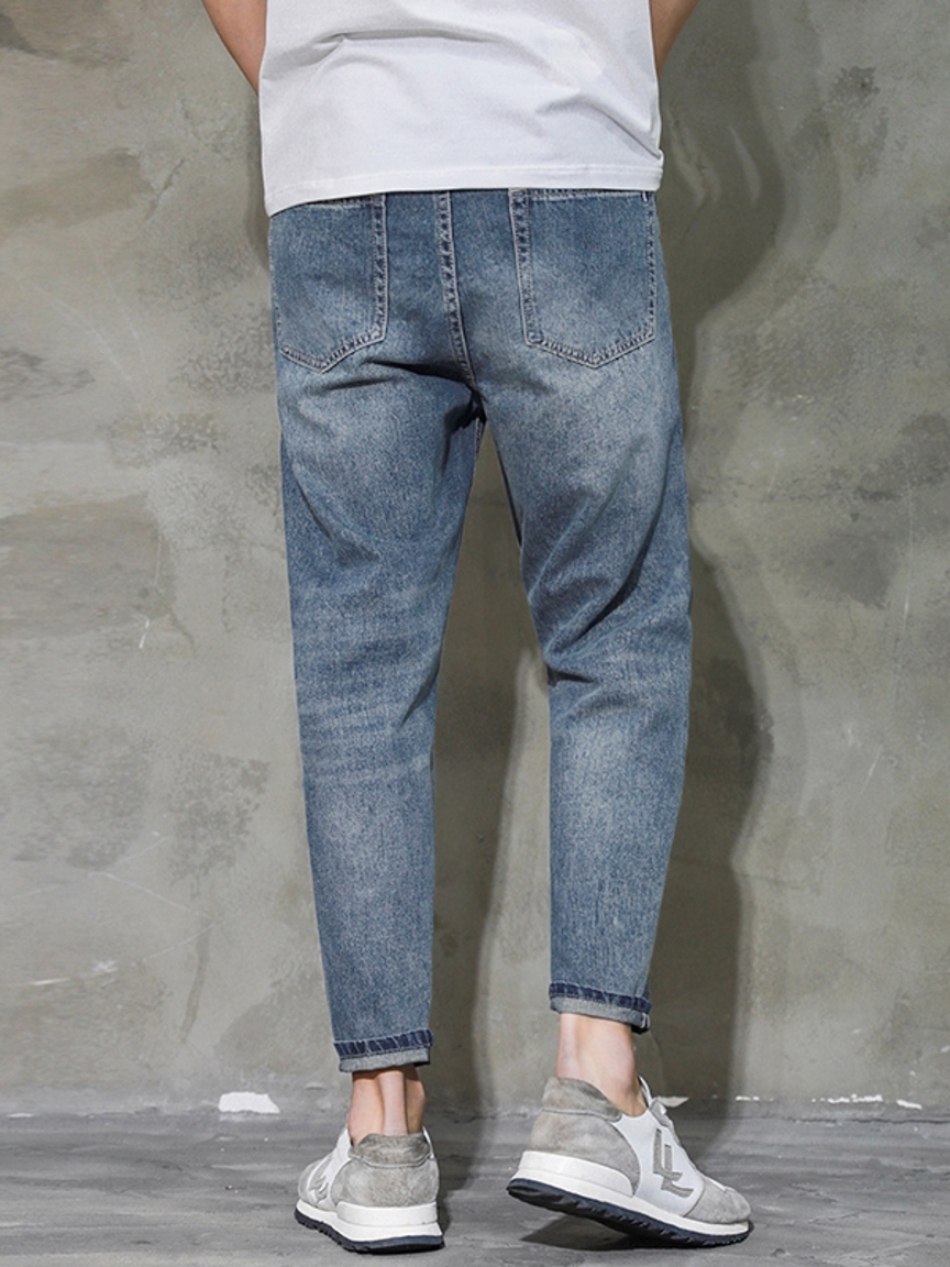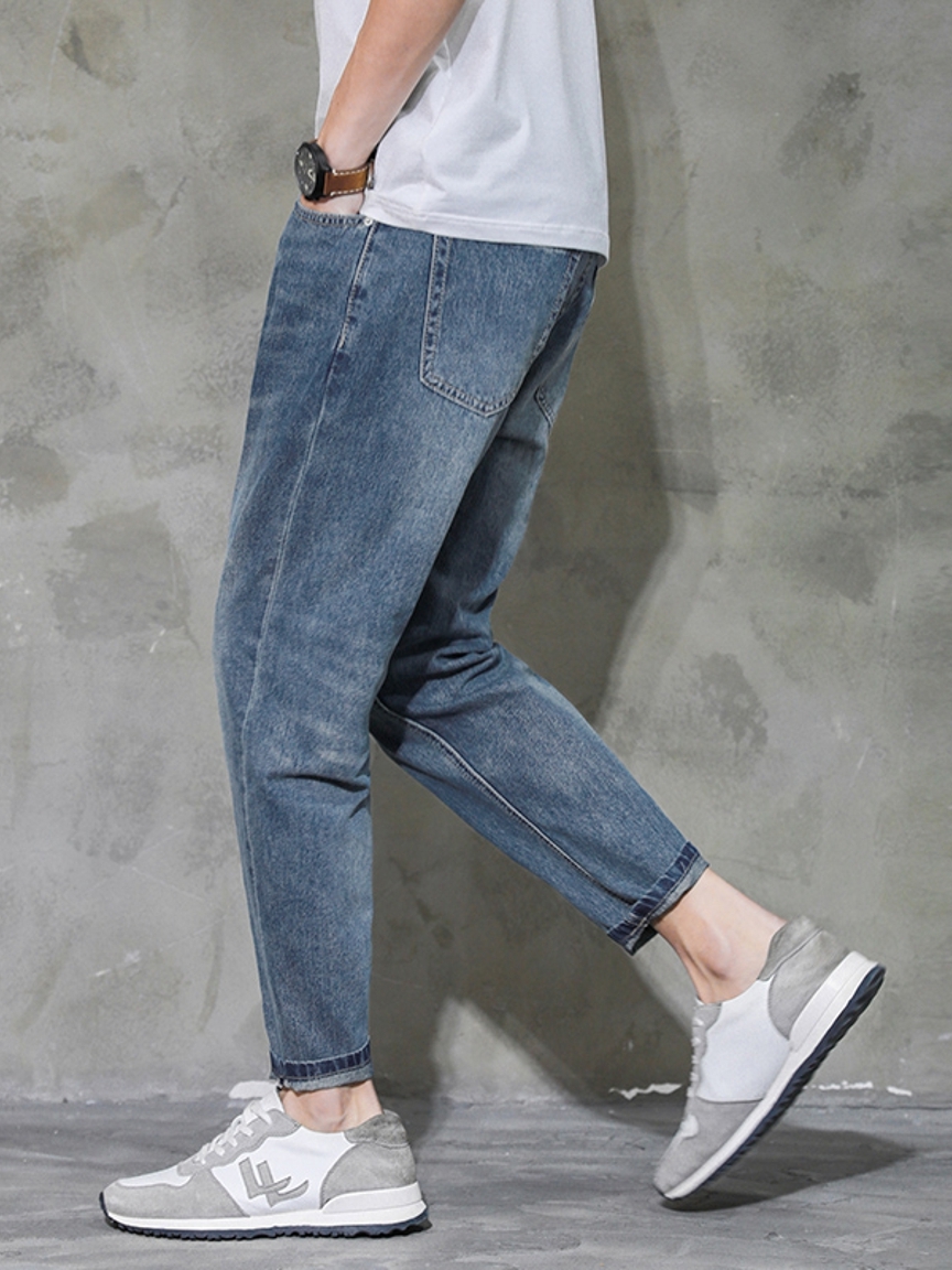水洗做旧的工艺不仅有复古气息,还让简约的外观不显单调感,九分的长度对小个子的男生也比较友好。