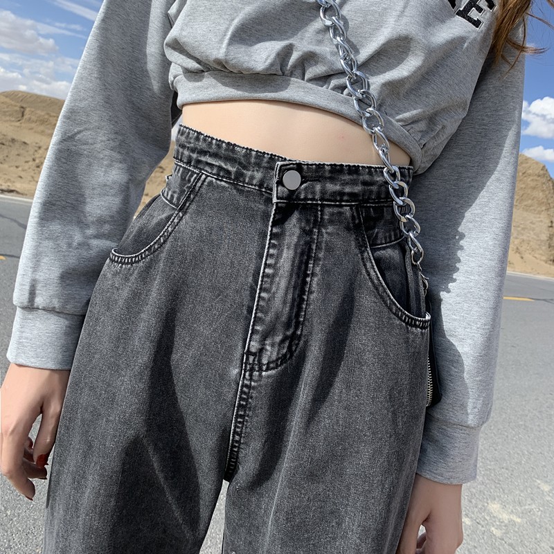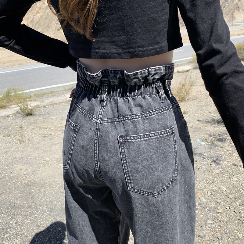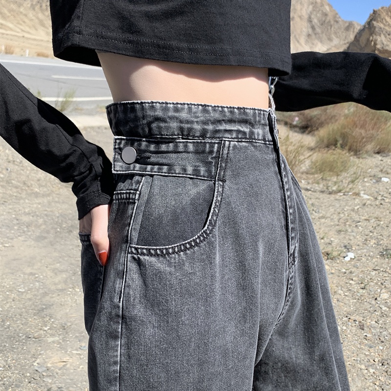 高腰设计,拉长身材比例。高腰牛仔裤,显瘦显腿长。直筒裤型,修饰腿部线条。
