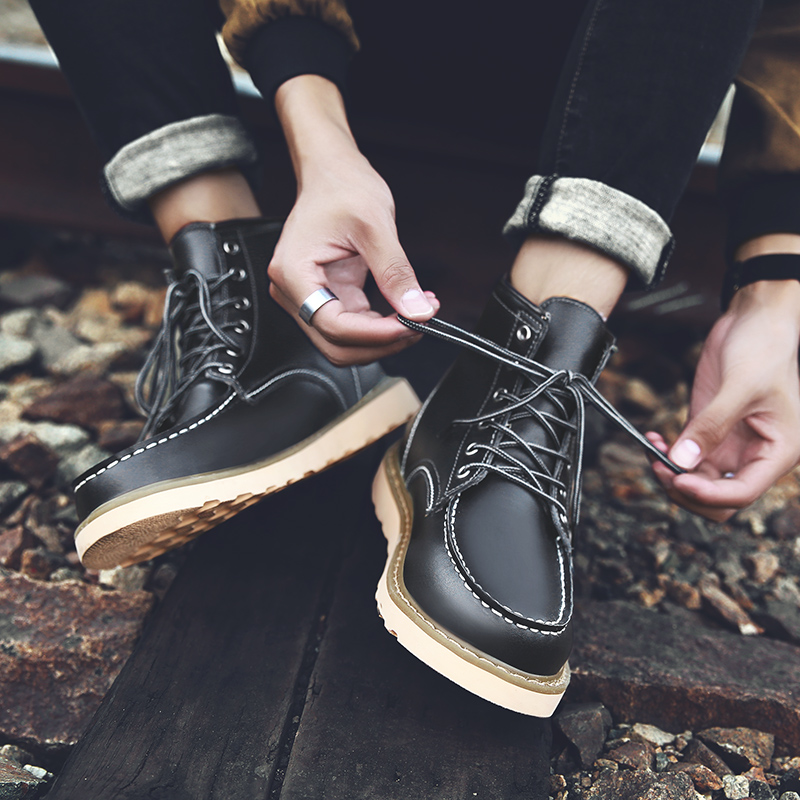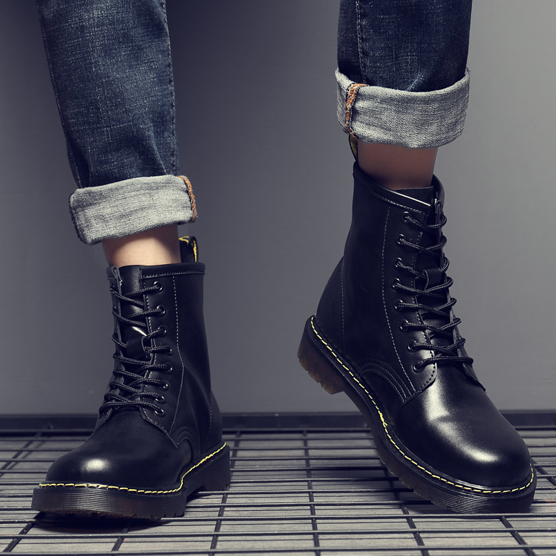高帮鞋型,拉长腿部线条。英伦风设计,时尚又帅气。黑色的色调,经典又百搭。