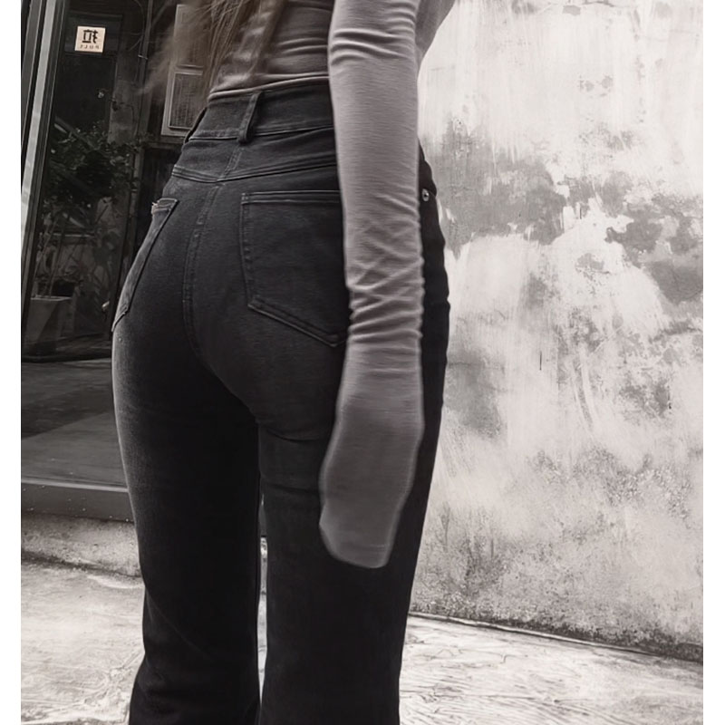 高腰的设计,拉长腿部线条,显瘦效果很好,高腰的版型,很显高挑,修身的剪裁,修饰腿部曲线,上身很有范。