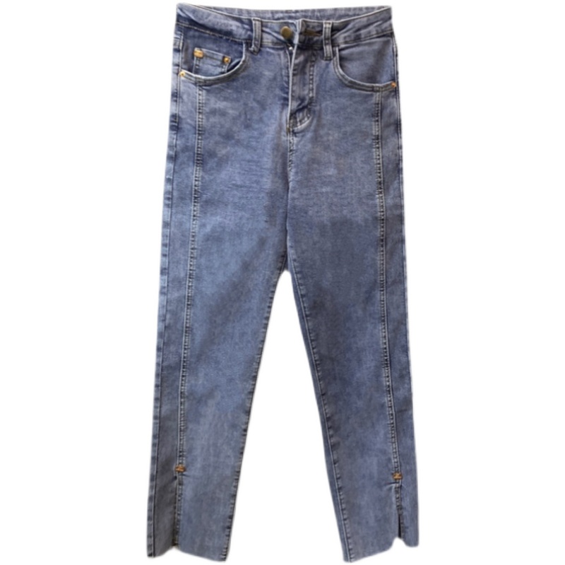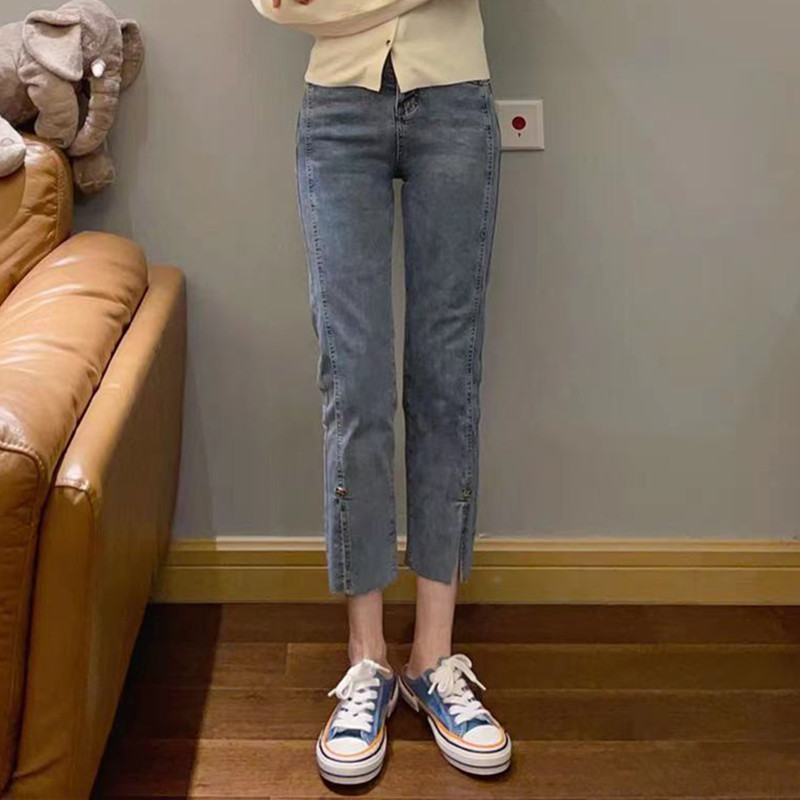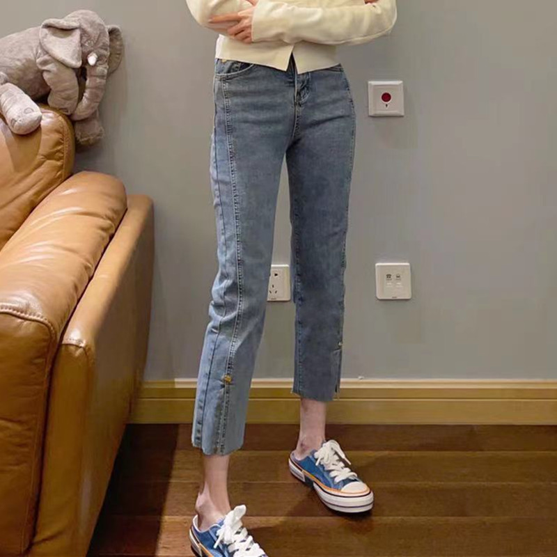 高腰设计,拉长身材比例。高腰牛仔裤,显瘦显腿长。直筒裤型,修饰腿部线条。
