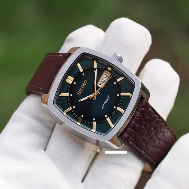 这款Seiko 酒桶自动机械表,采用人工合成蓝宝石玻璃镜面材质,硬度高,防刮耐磨,使用寿命长。